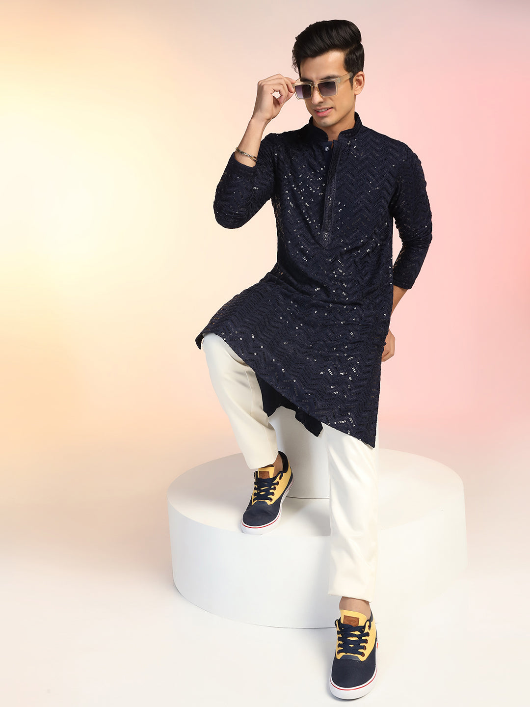 Navy Blue Heavy Sequin Work Kurta For Men
