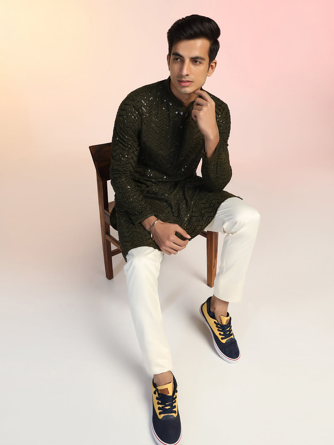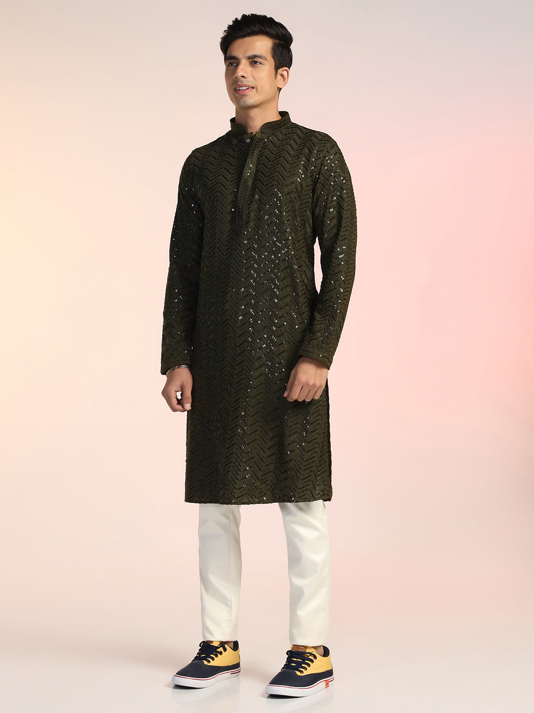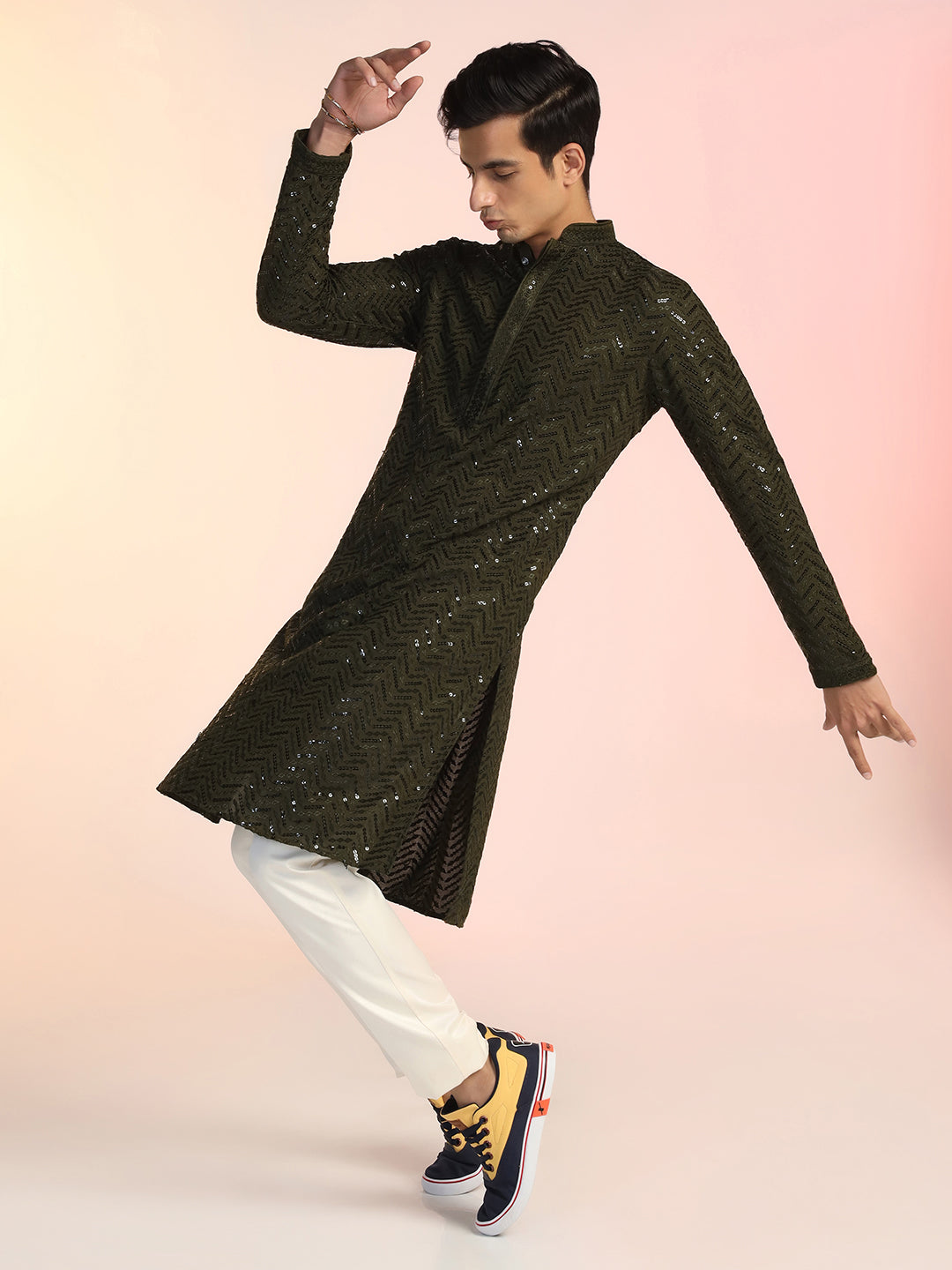 Olive Green Heavy Sequin Work Kurta For Men