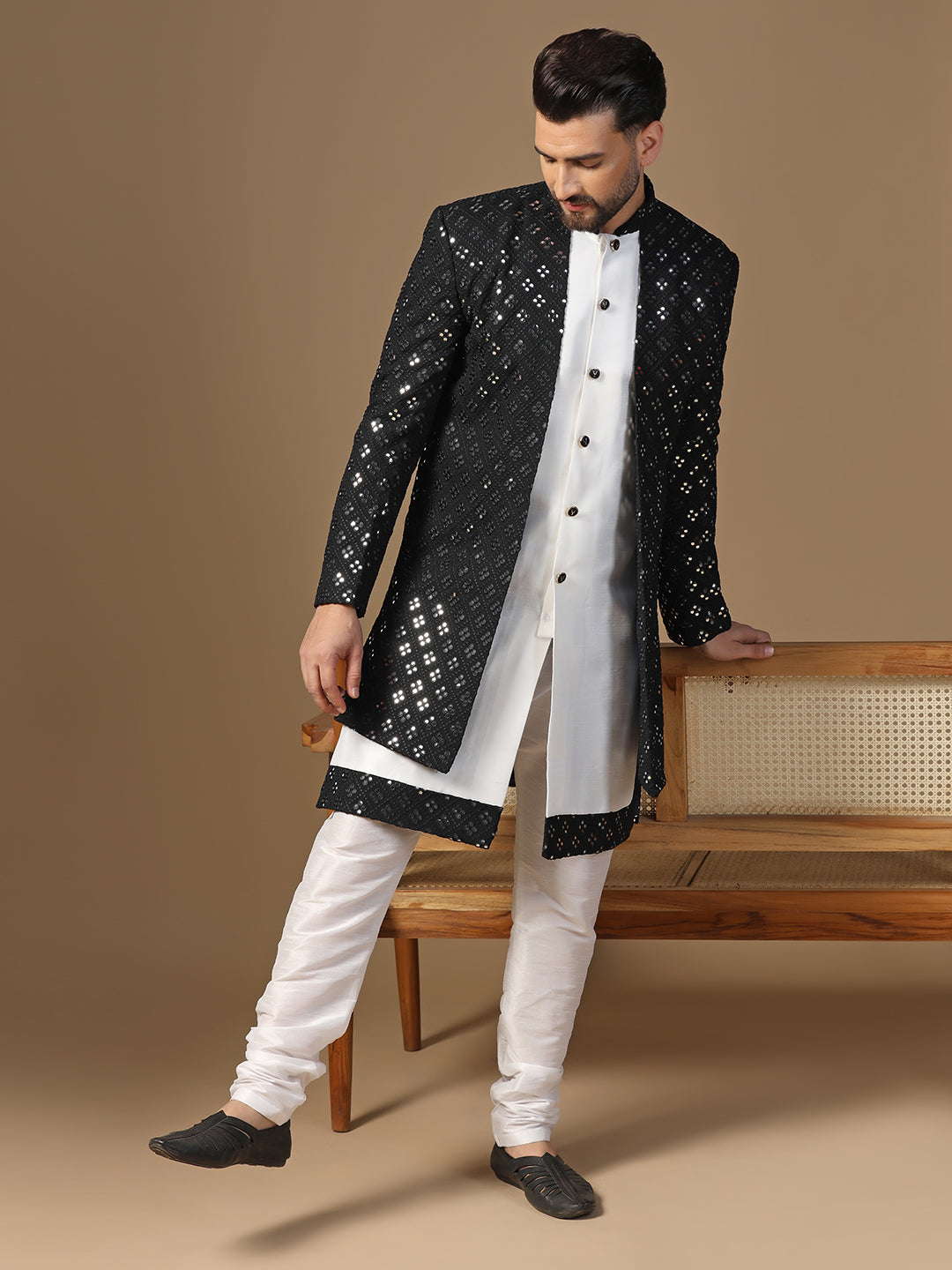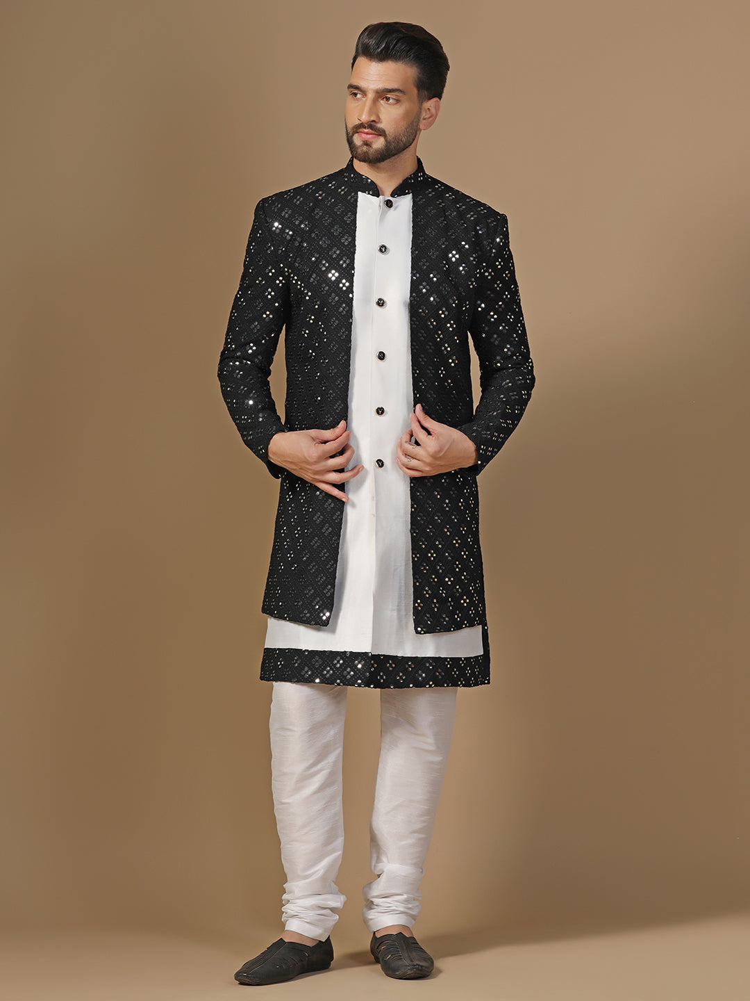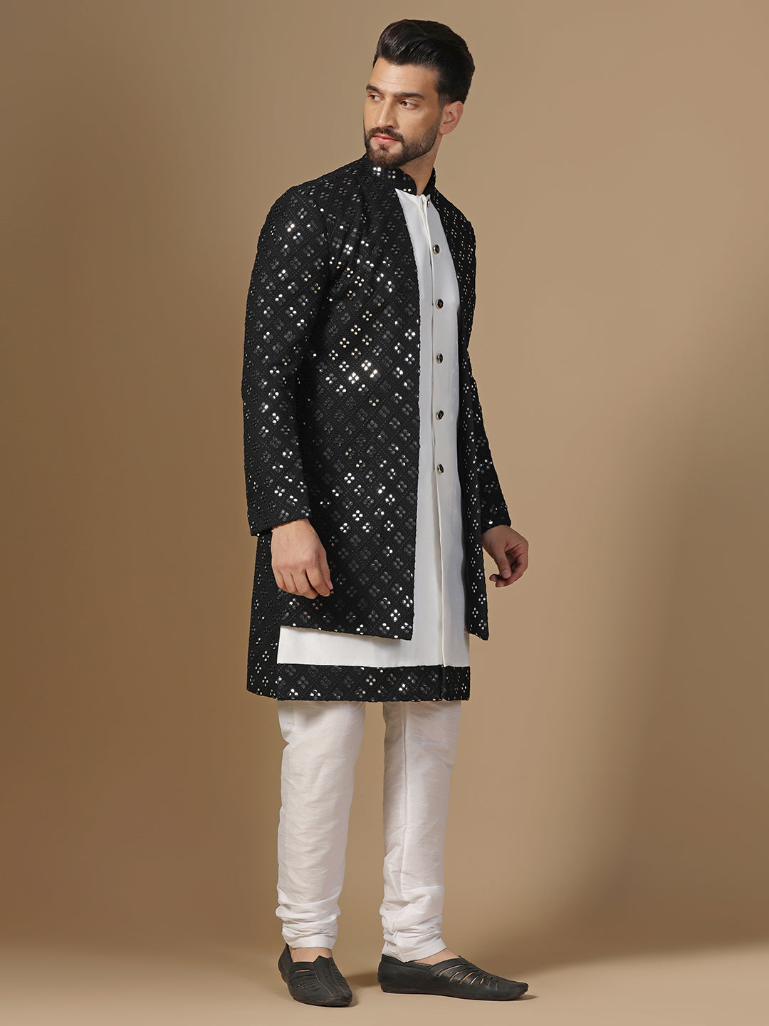 Men Black and White Mirror Work Embroidered Kurta Sherwani Churidar Set