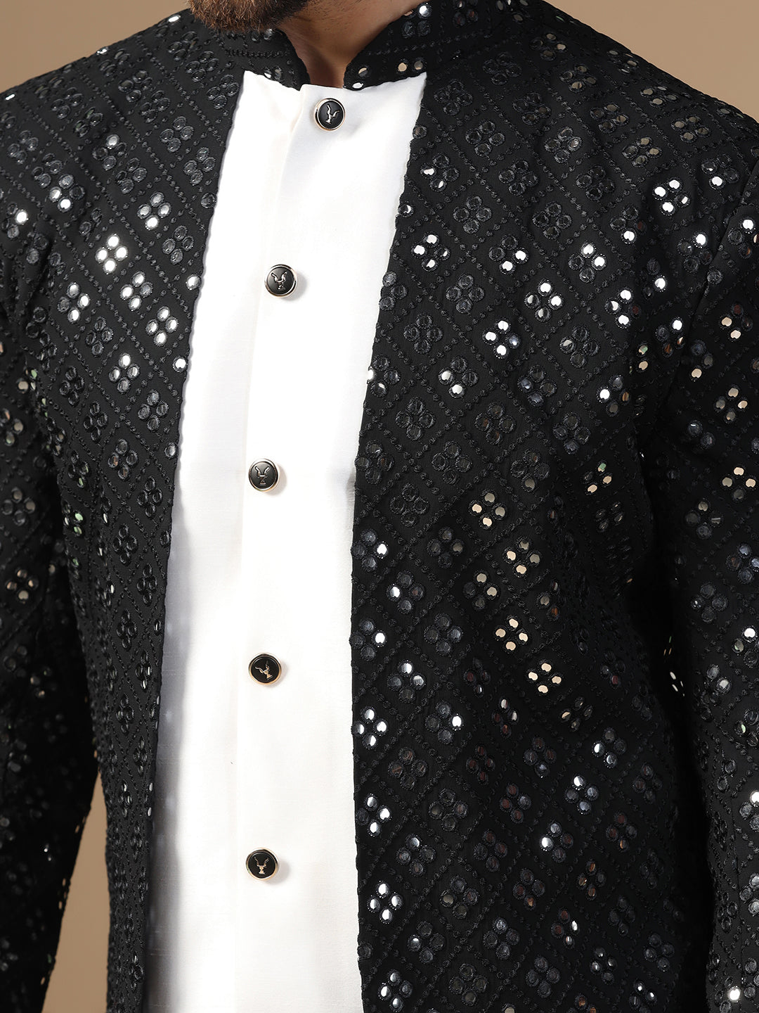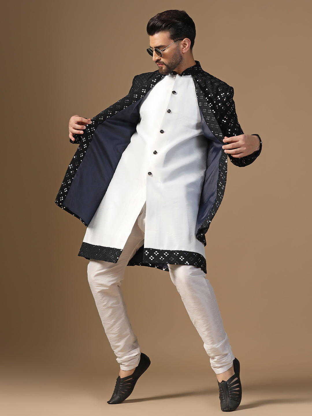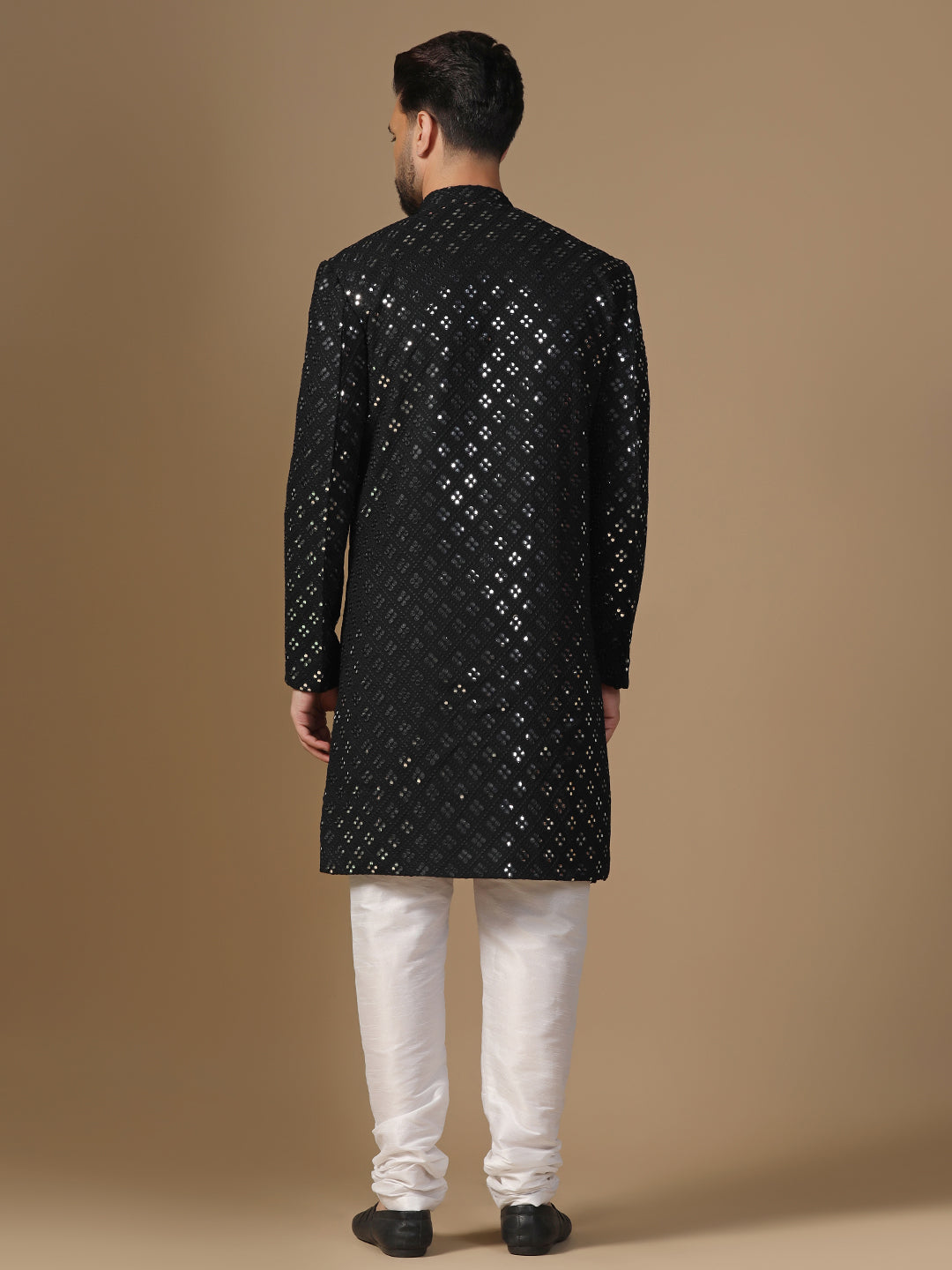 Men Black and White Mirror Work Embroidered Kurta Sherwani Churidar Set