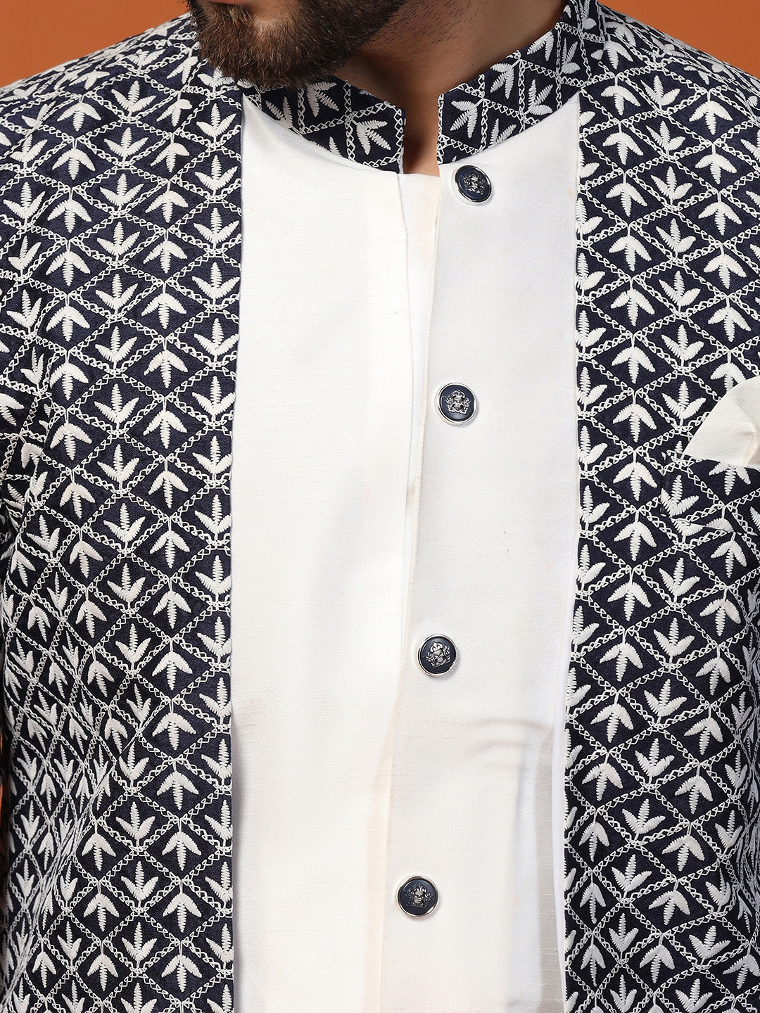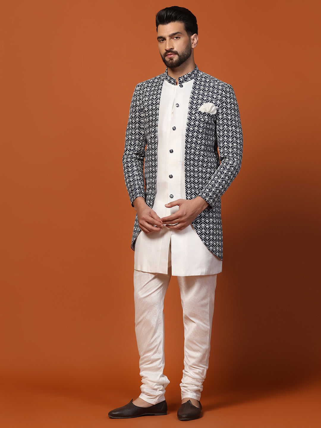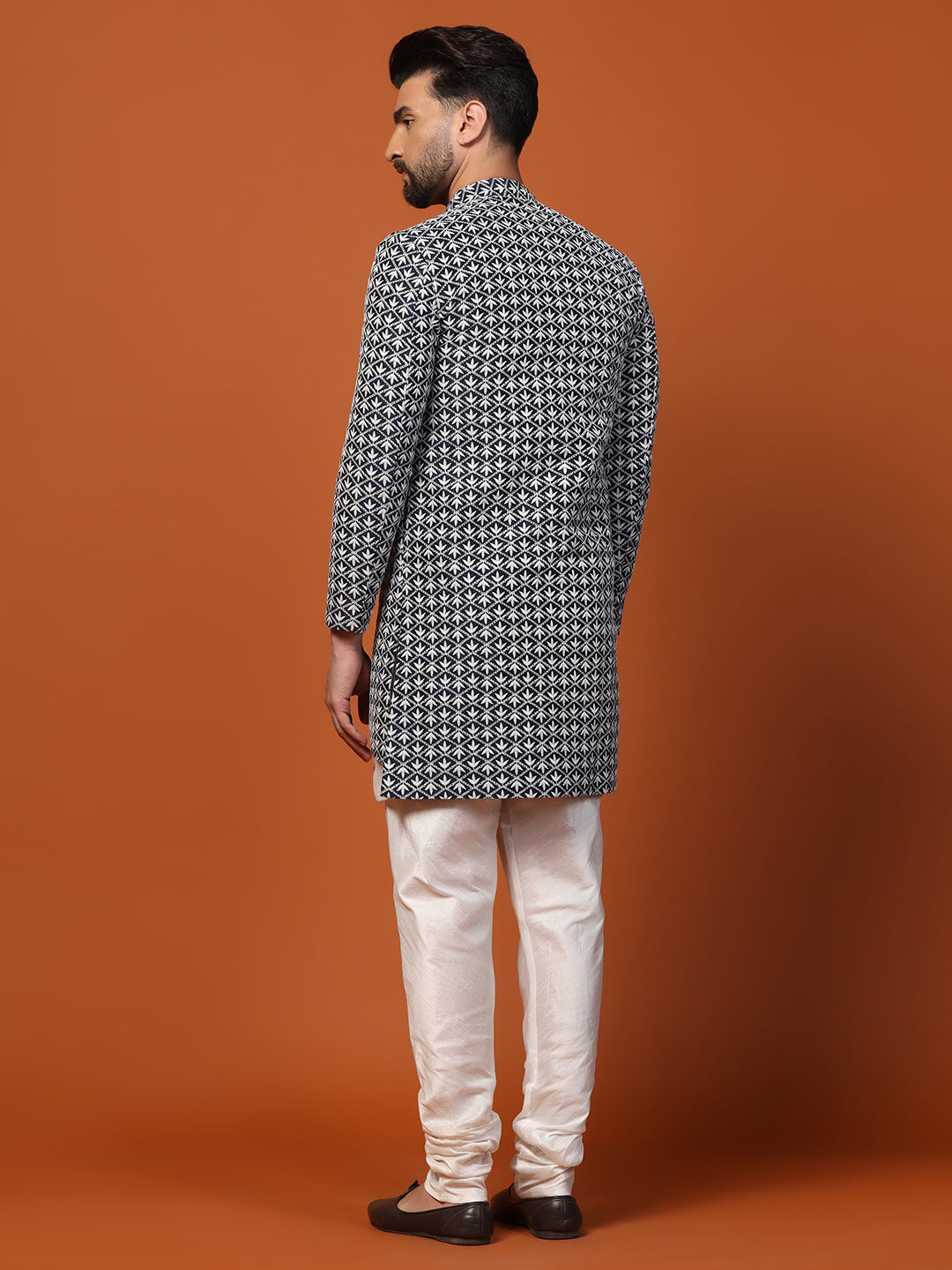 Men Blue White Embrodiered Kurta Sherwani Churidar Set