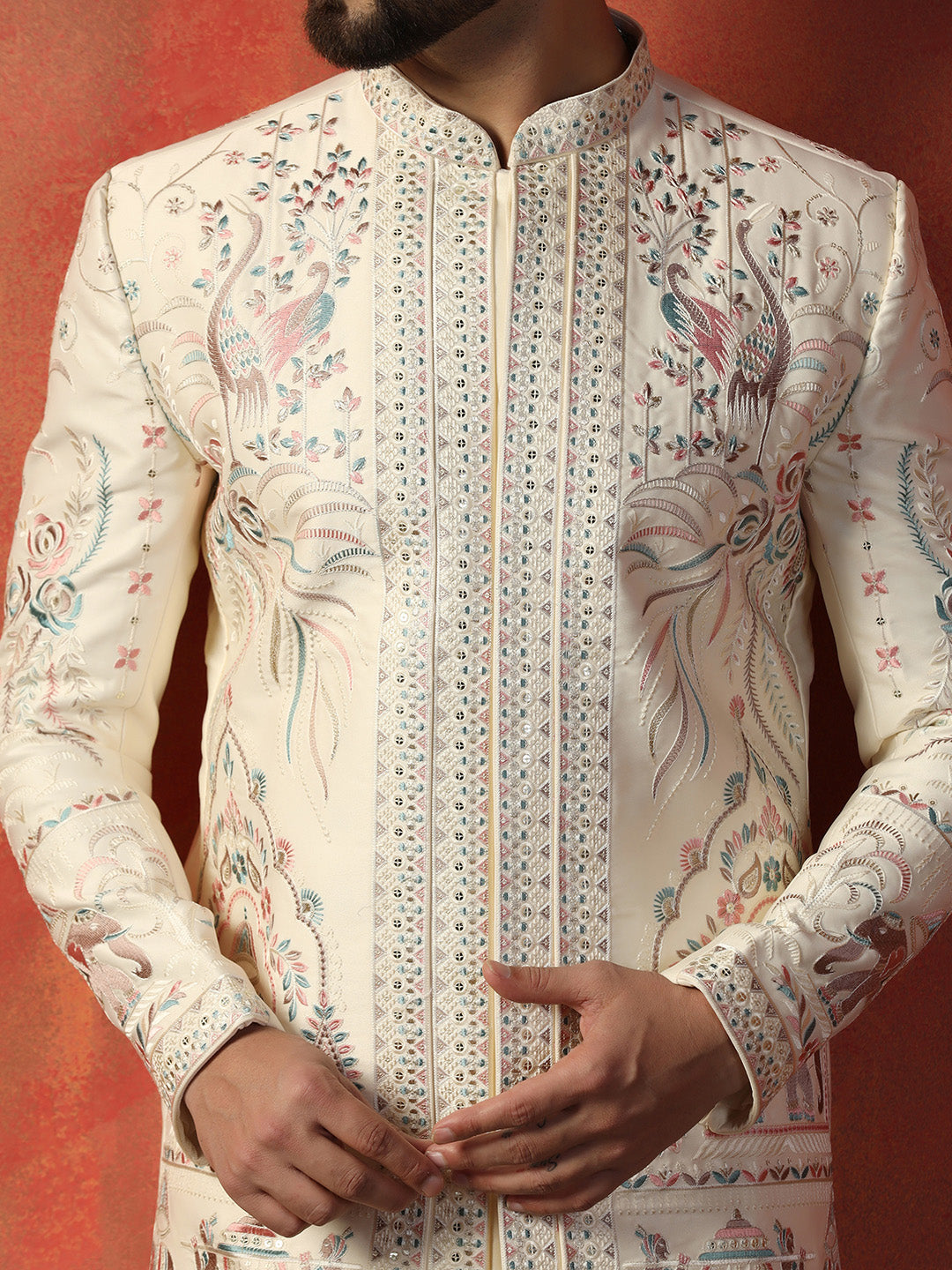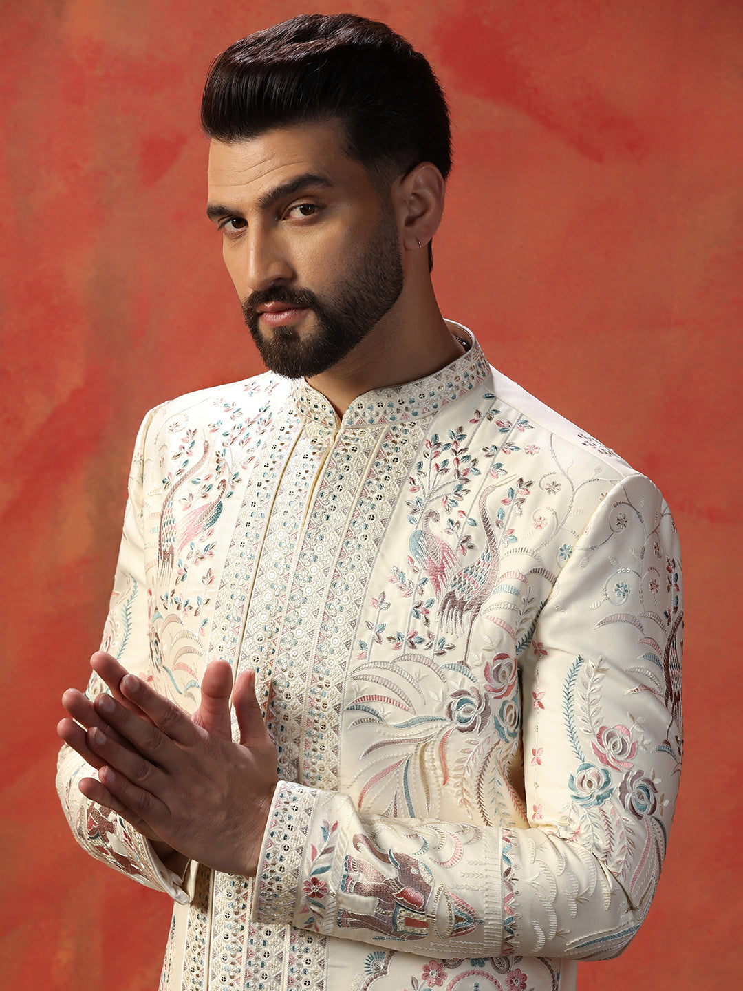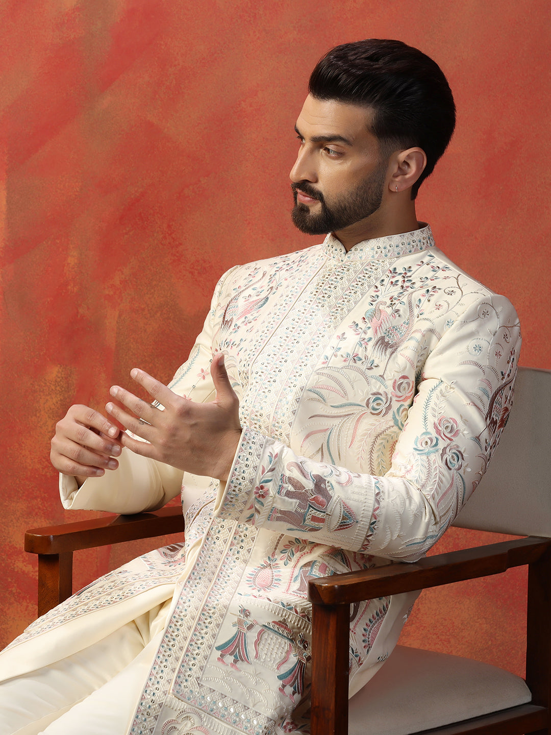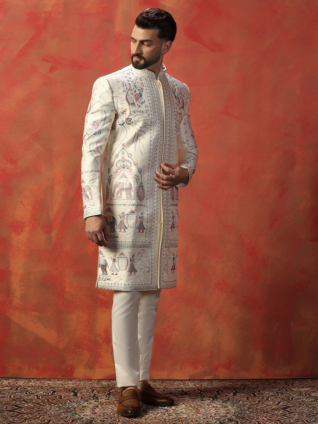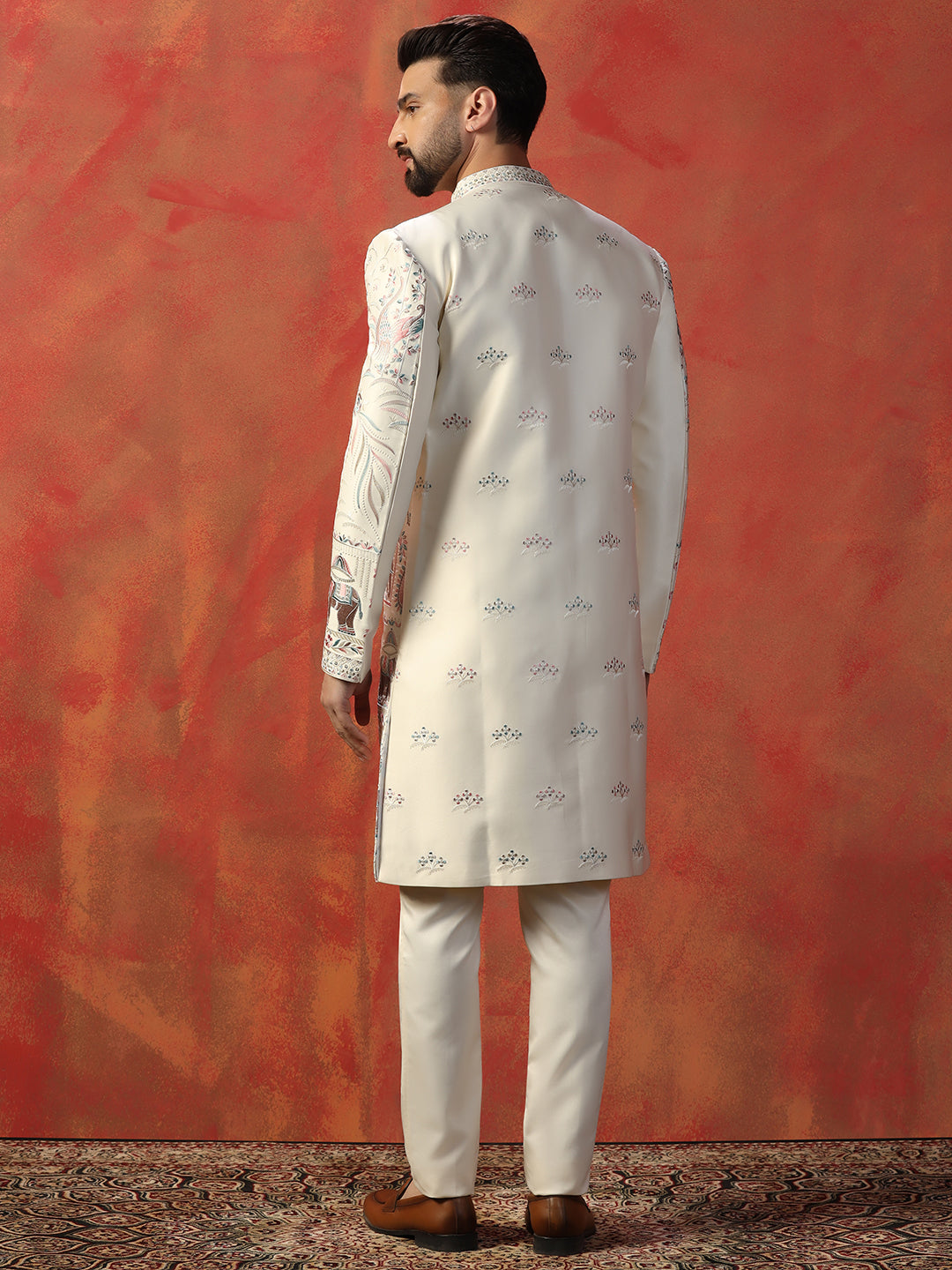 Men Off White Indowestern Trouser Set