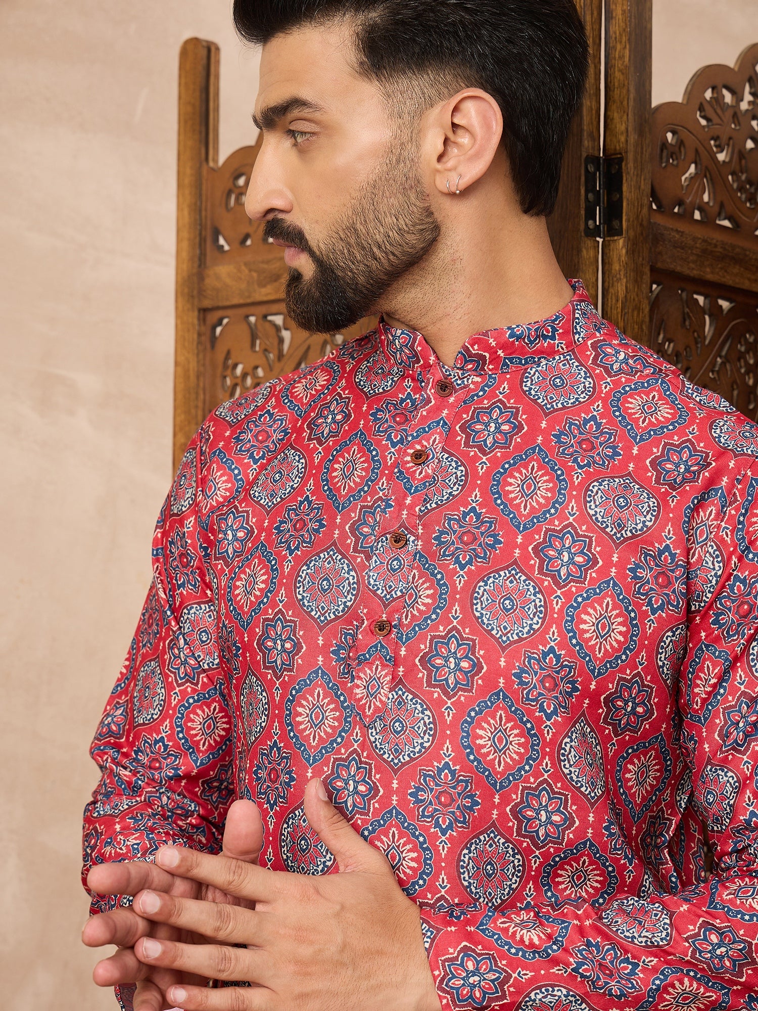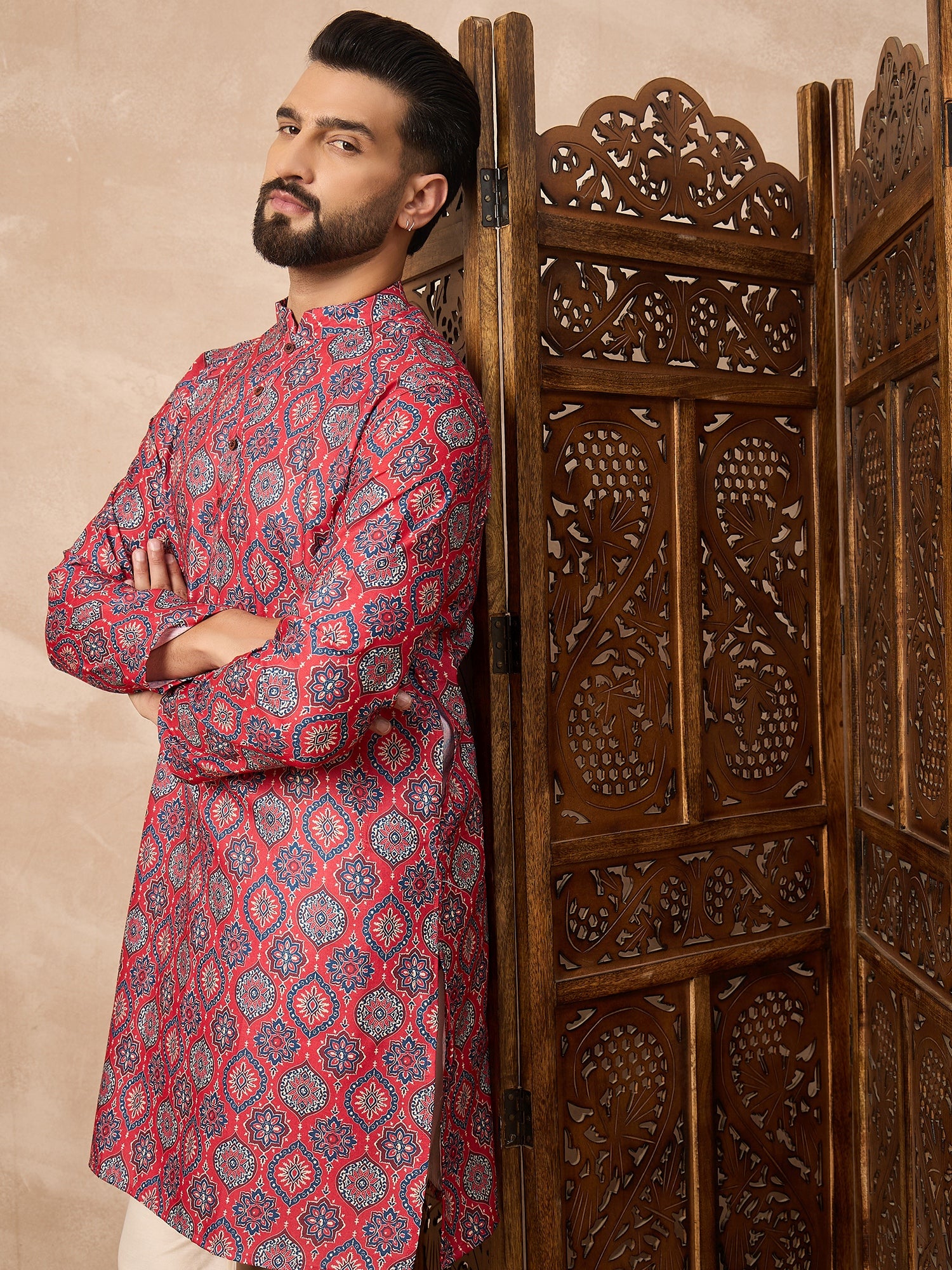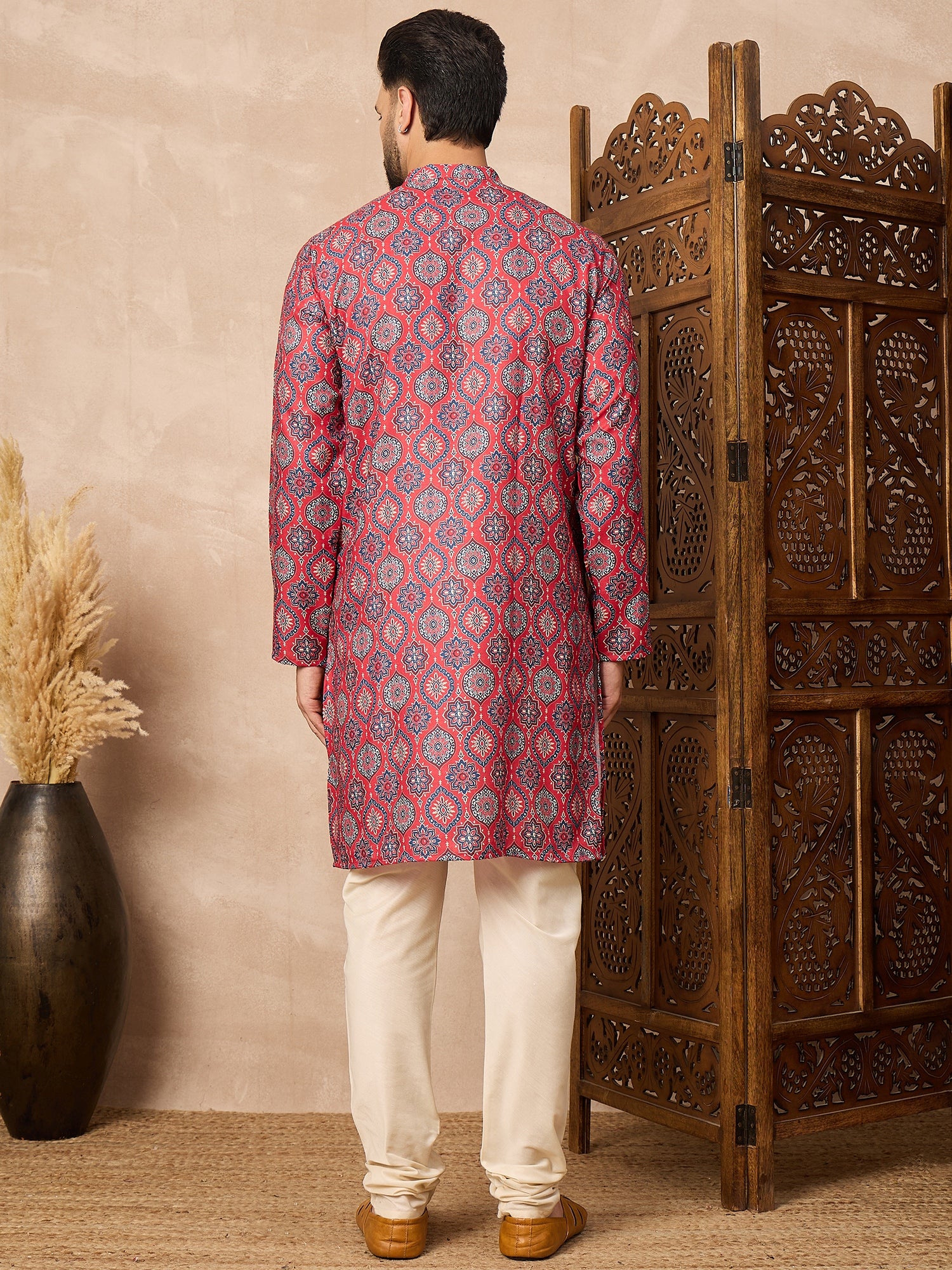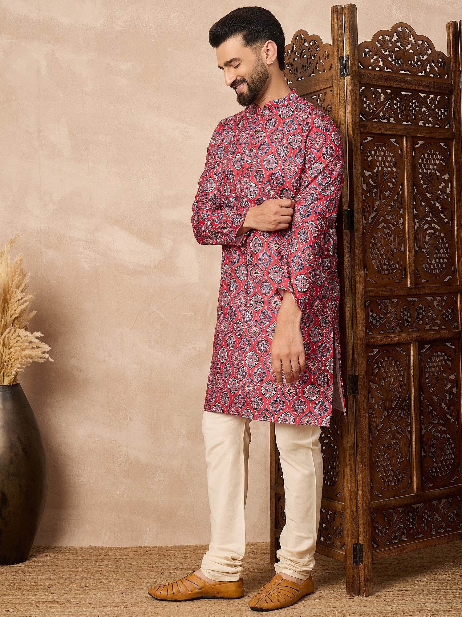Celebrate tradition in style with the Prakatha Men's Red Floral Printed Kurta and Cream pant Set. Made from a soft cotton blend fabric, this outfit features a striking Mughal-inspired geometric print with a classic mandarin collar and wooden-style buttons. Paired with comfortable cream churidar pants, it's perfect for festivals, weddings, and cultural events. Elegant, breathable, and effortlessly festive—this set brings timeless tradition to modern fashion.