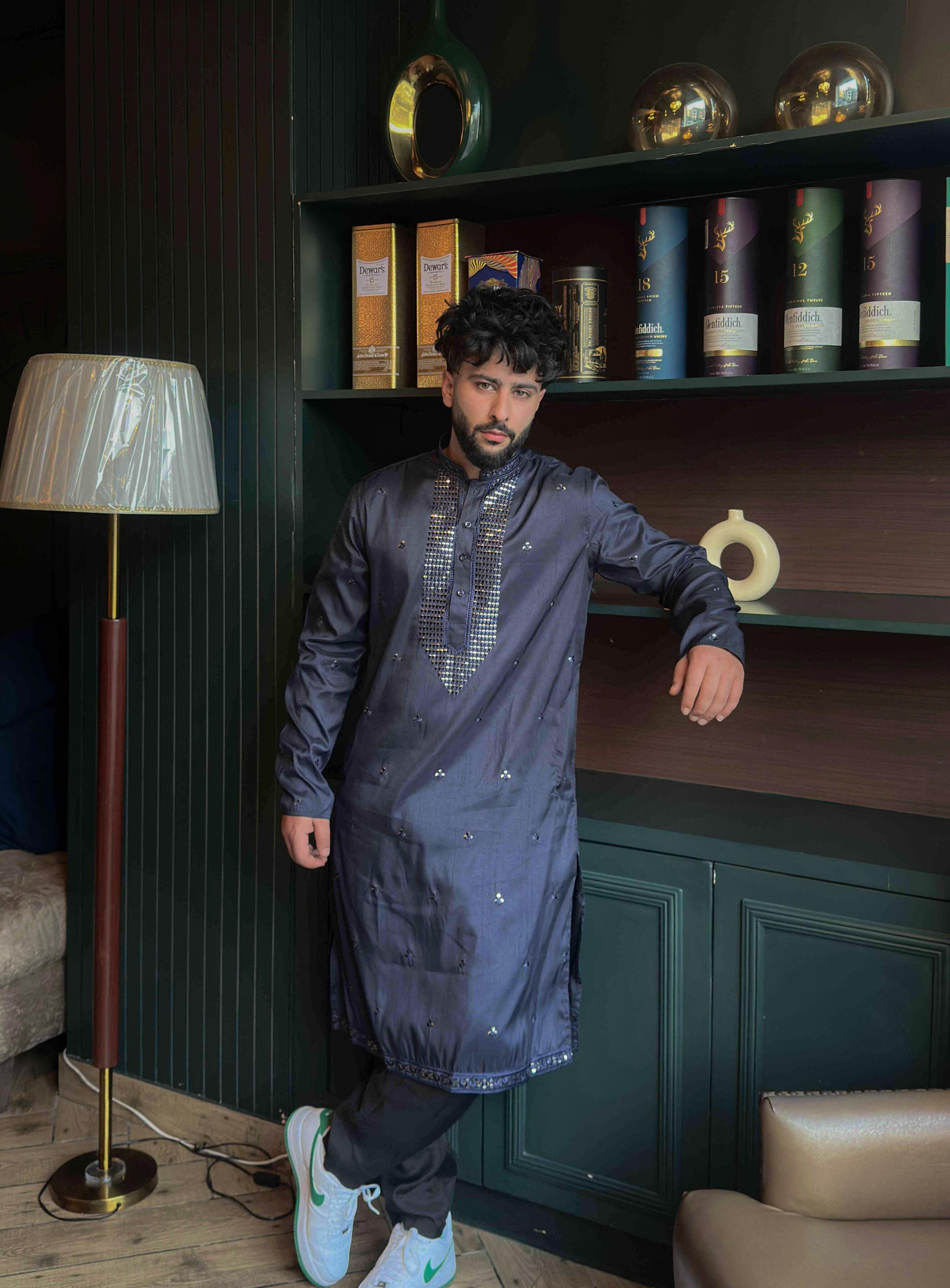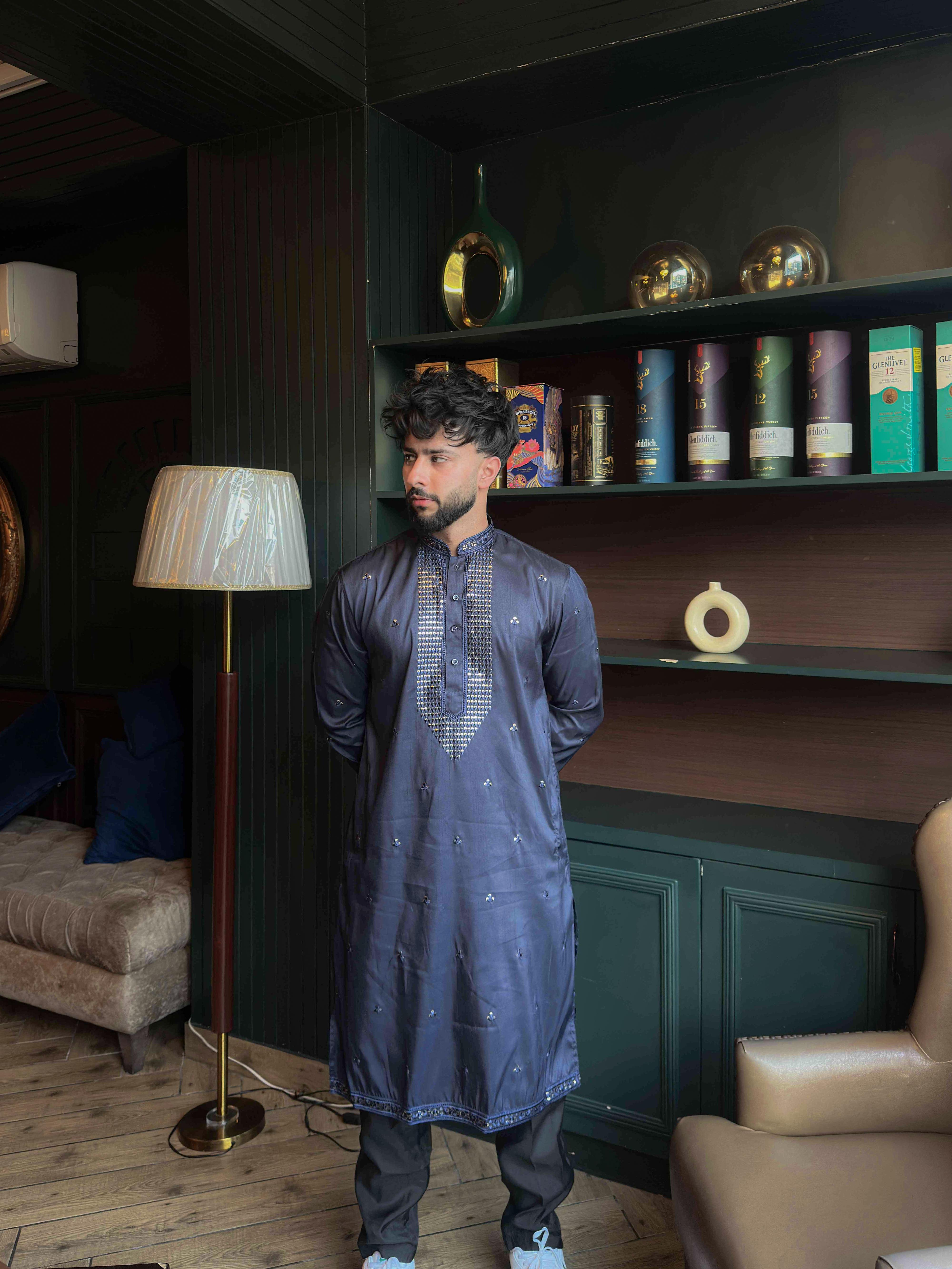 Navy Blue Heavy Mirror Work Design Kurta for Men with Intricate Embroidery