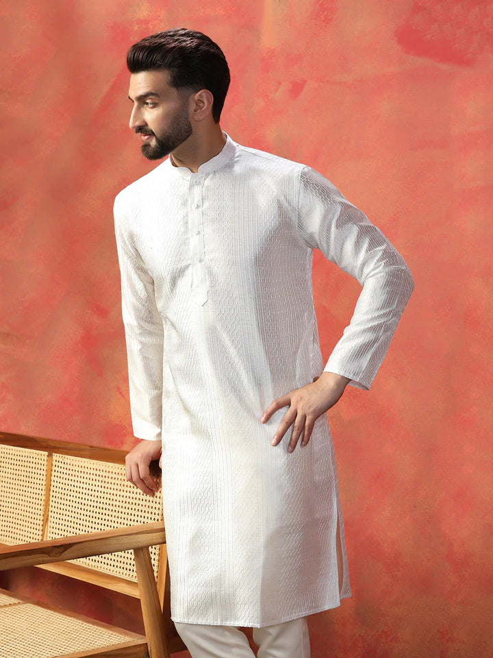 Experience luxury with this Men Embroidery Kurta from Prakatha, crafted from premium Bangalore Silk. Designed with intricate Embroidery and a sleek silhouette, it blends tradition with modern elegance, making it the perfect choice for festive celebrations and formal gatherings.