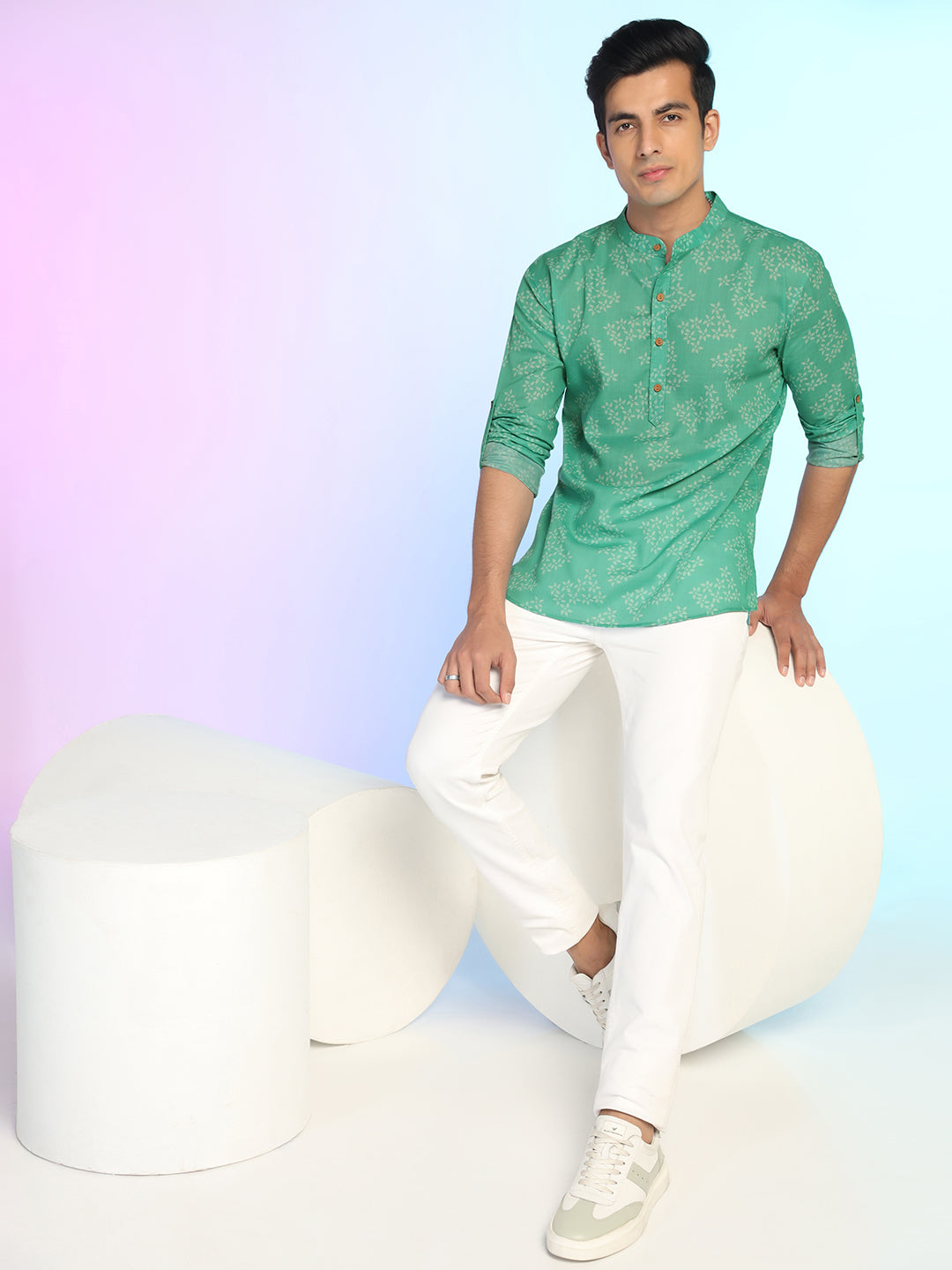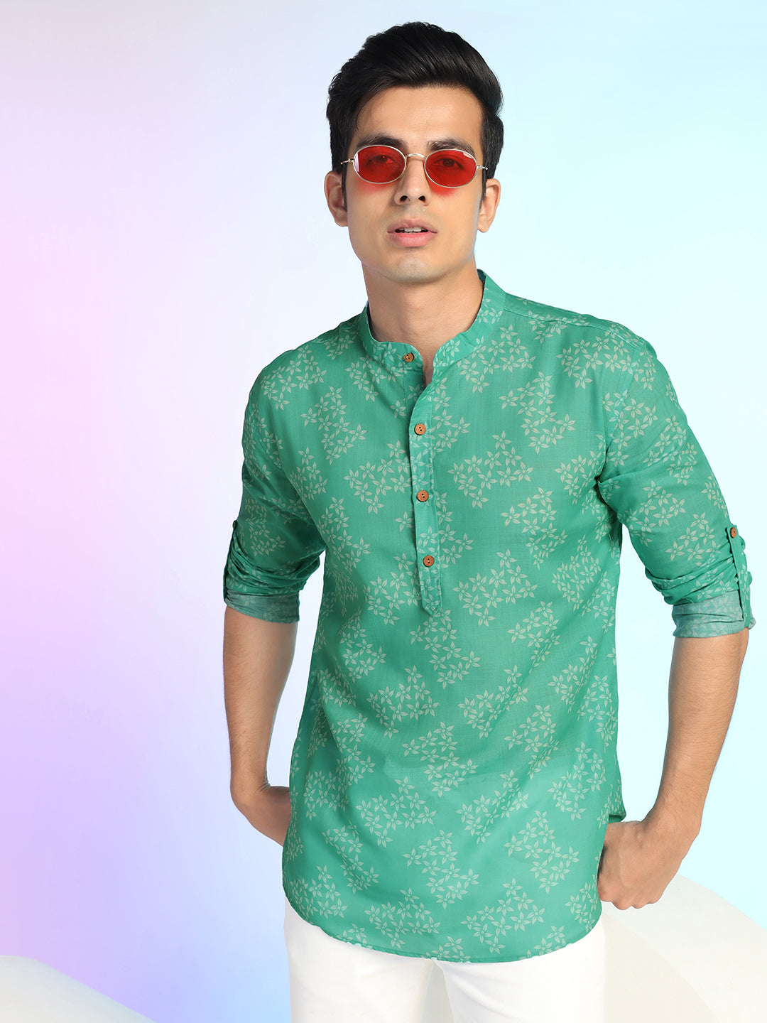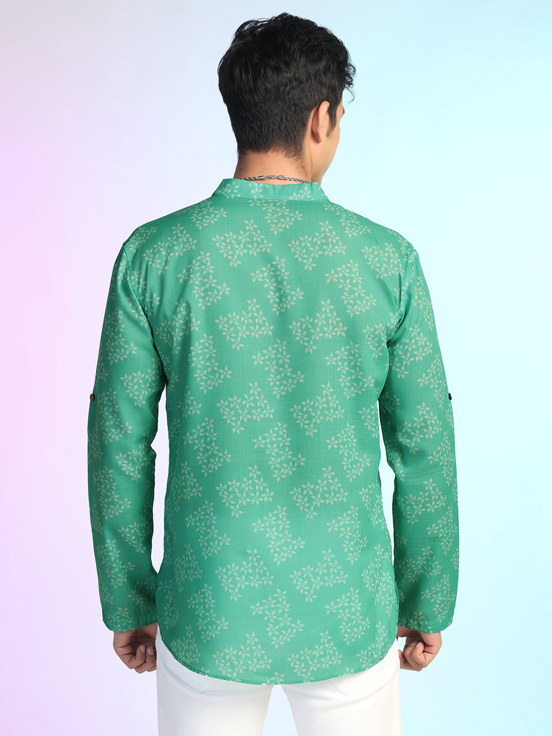 This stylish Green Printed Kurta from Prakatha is crafted from lightweight Rayon fabric, ensuring a soft and smooth feel against the skin. The Mandarin collar enhances its refined look, while the full-length sleeves with roll-up tab detailing offer versatility. With its straight-cut silhouette and vibrant green shade, this kurta pairs effortlessly with jeans, chinos, or ethnic bottoms for a smart yet relaxed vibe.