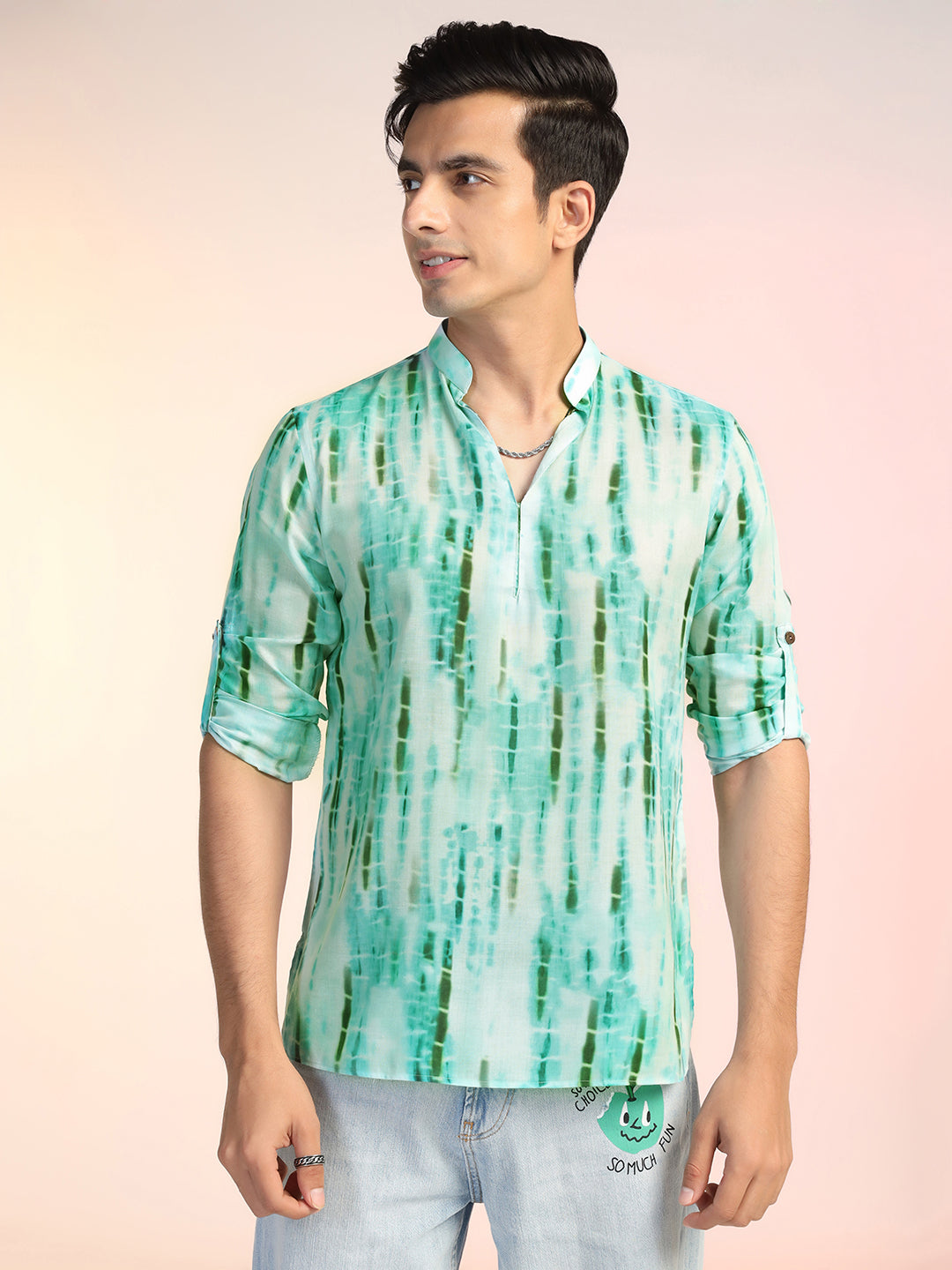Green Roll-Up Sleeve Printed Short Kurta For Men