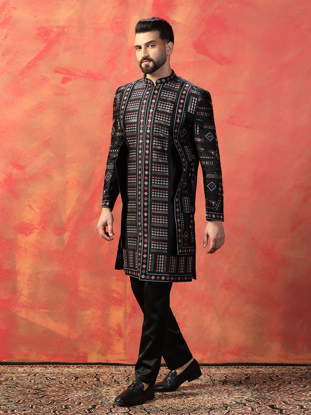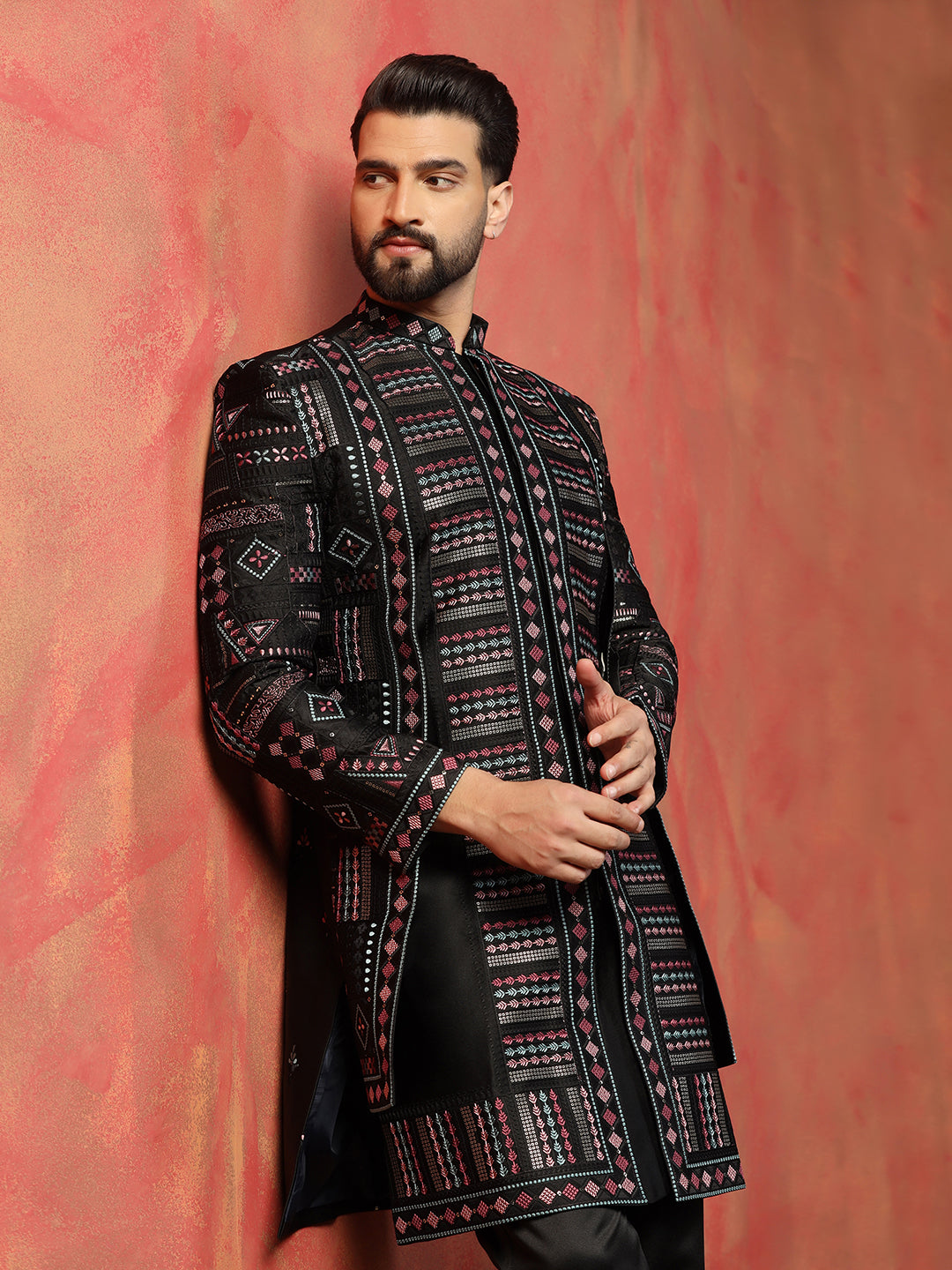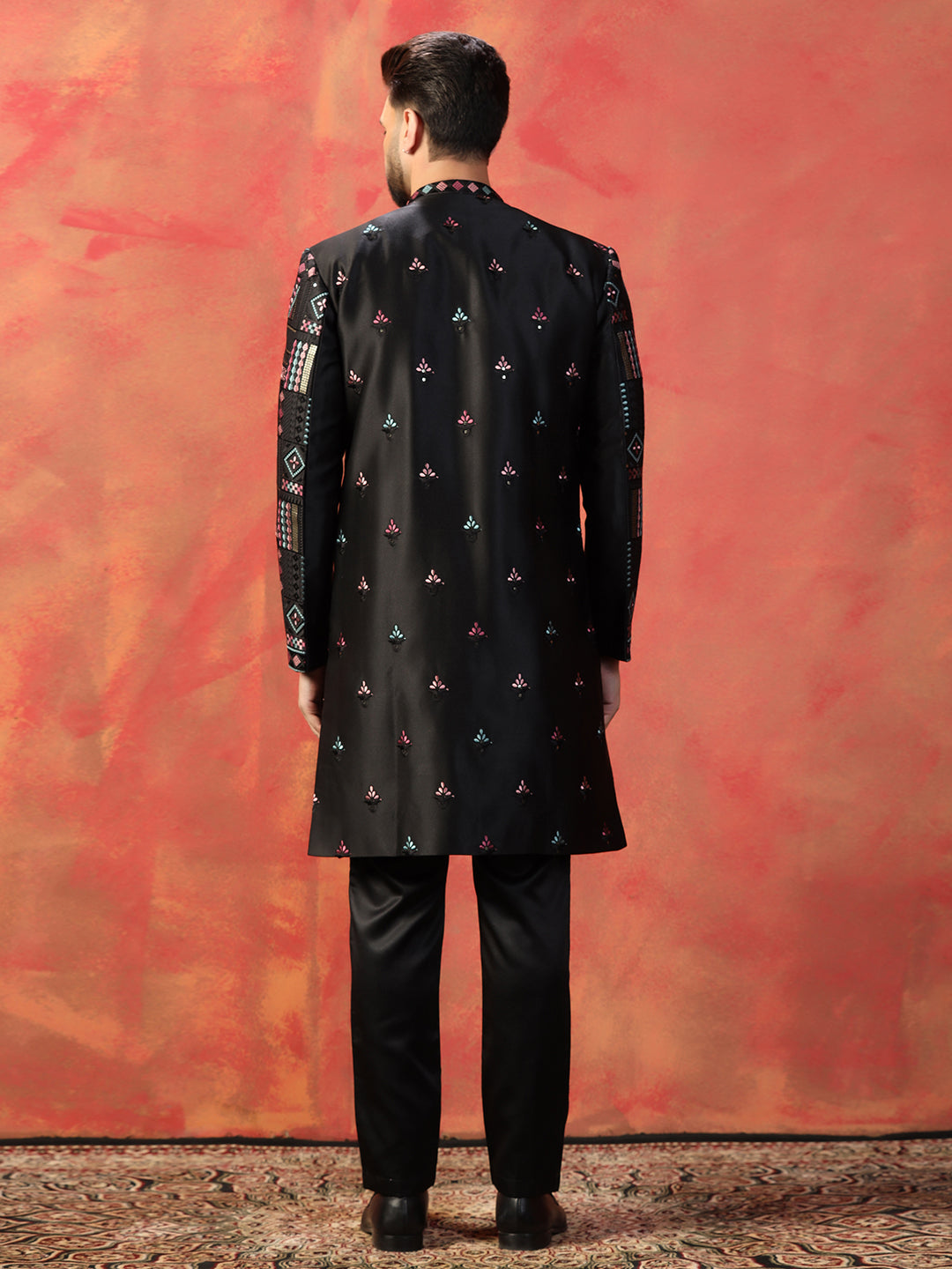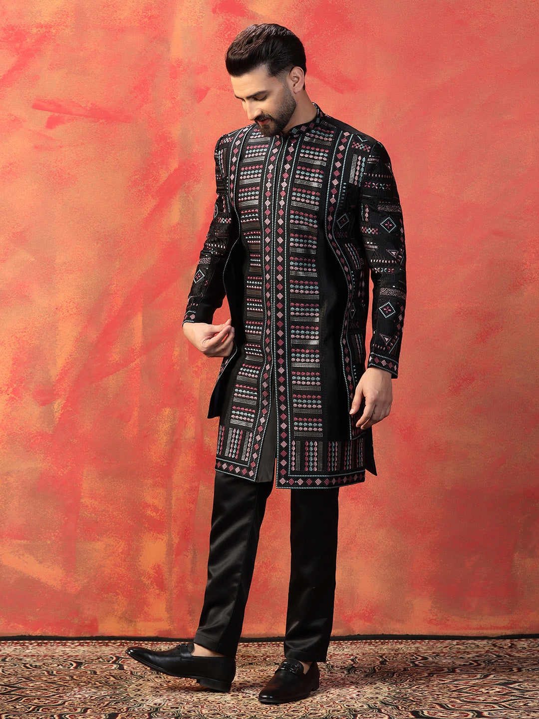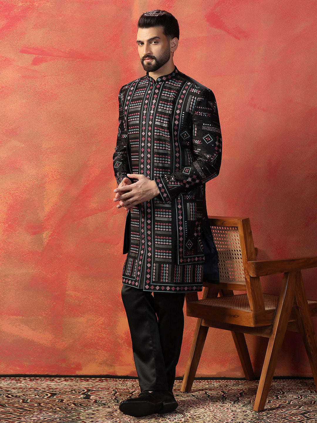 Men Black Embroidery Multicolor Indowestern Trouser Set