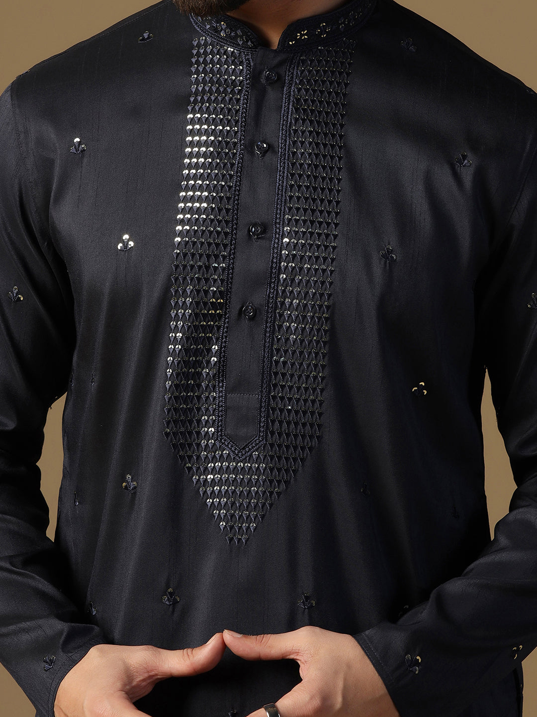 Traditional Heavy Embroidery On Neck With Mirror Work Kurta Trouser Set In Black For Men