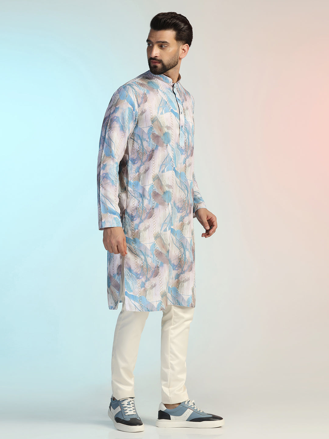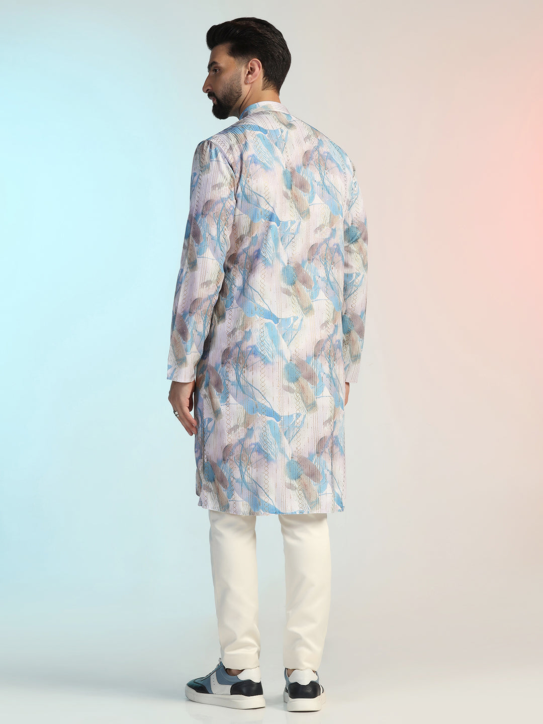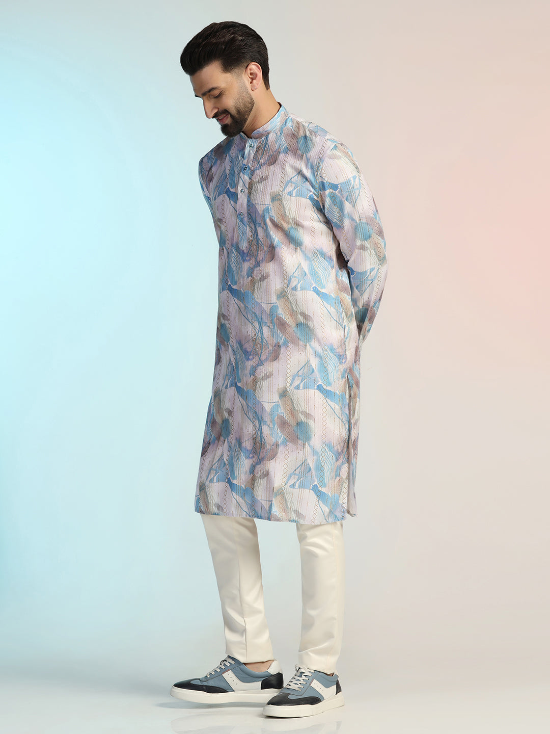 Experience luxury with this Men Blue Digital Print Kurta Trouser Set from Prakatha, crafted from premium Cotton Blend. Designed with intricate Digital Print and a sleek silhouette, it blends tradition with modern elegance, making it the perfect choice for festive celebrations and formal gatherings.