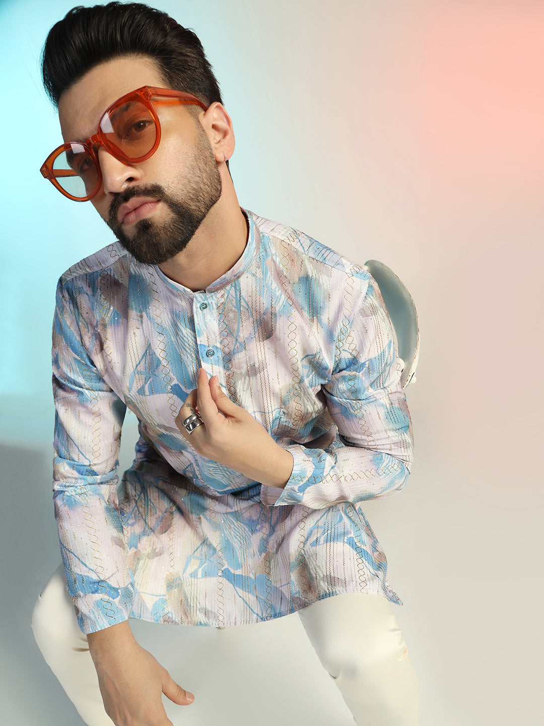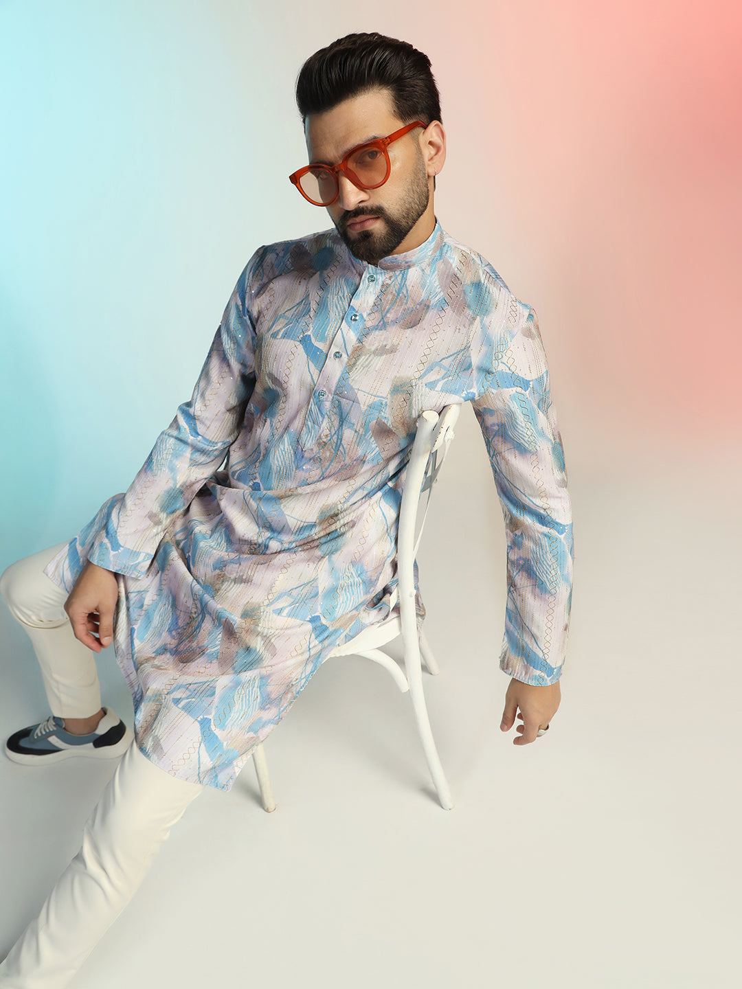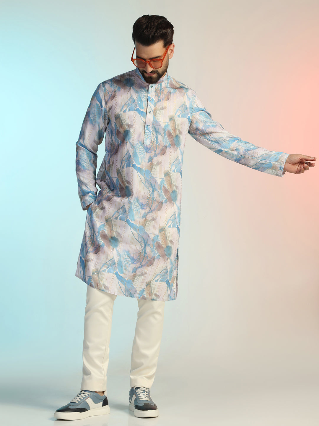 Experience luxury with this Men Blue Digital Print Kurta Trouser Set from Prakatha, crafted from premium Cotton Blend. Designed with intricate Digital Print and a sleek silhouette, it blends tradition with modern elegance, making it the perfect choice for festive celebrations and formal gatherings.