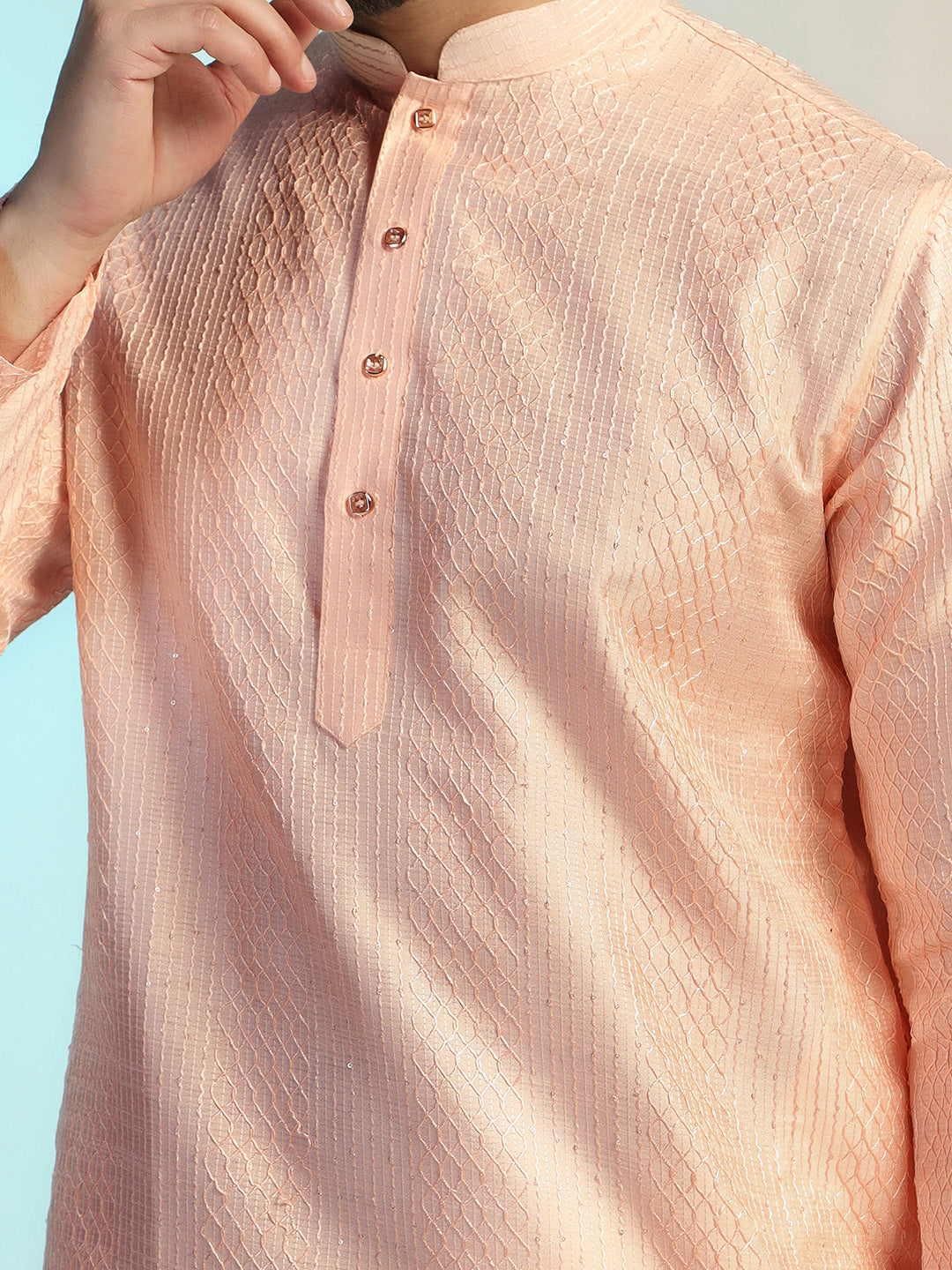 Peach Color Kurta Trouser Set For Men โ€“ Thread Work Embroidery On Premium Silk