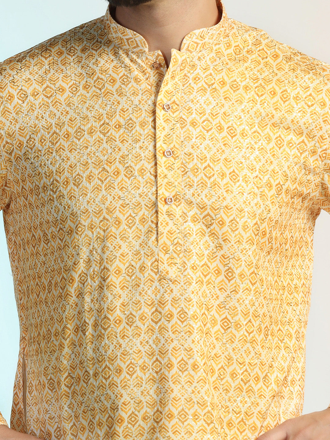 Experience luxury with this Men Yellow Digital Print Kurta Trouser Set from Prakatha, crafted from premium Cotton Blend. Designed with intricate Digital Print and a sleek silhouette, it blends tradition with modern elegance, making it the perfect choice for festive celebrations and formal gatherings.