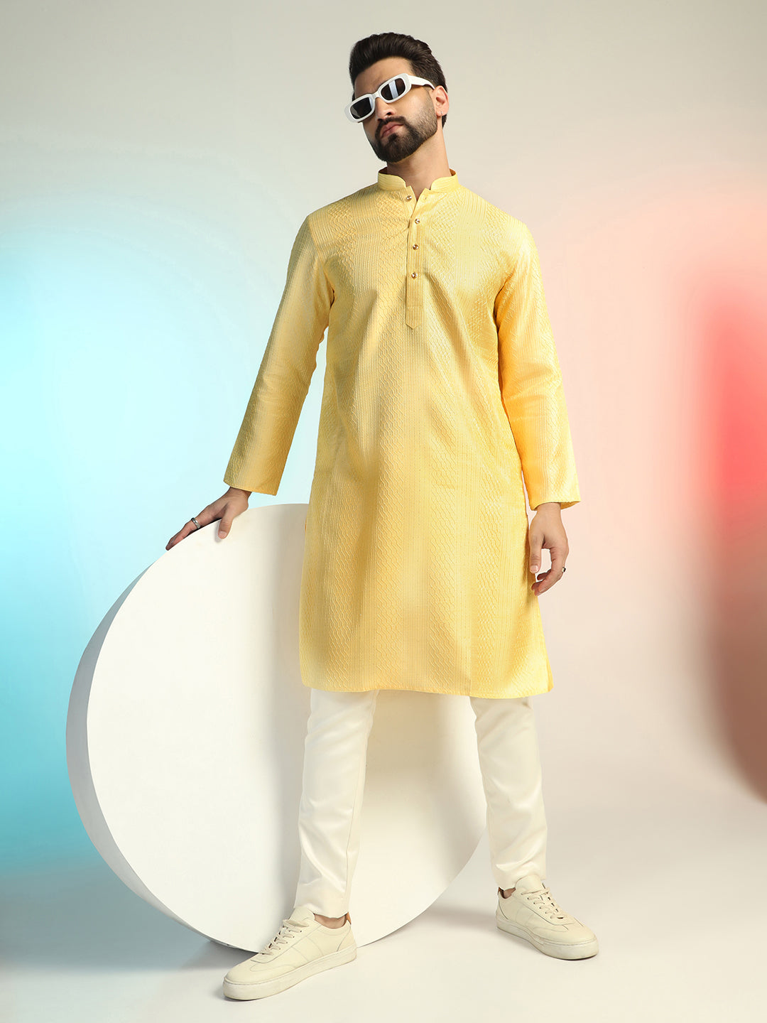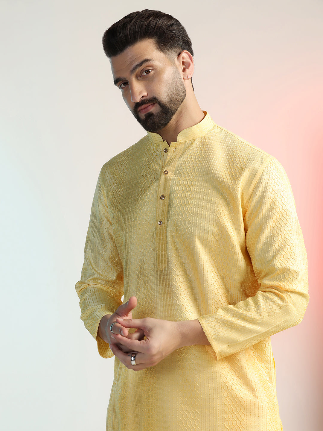 Experience luxury with this Men Yellow Embroidery Kurta from Prakatha, crafted from premium Bangalore Silk. Designed with intricate Embroidery and a sleek silhouette, it blends tradition with modern elegance, making it the perfect choice for festive celebrations and formal gatherings.