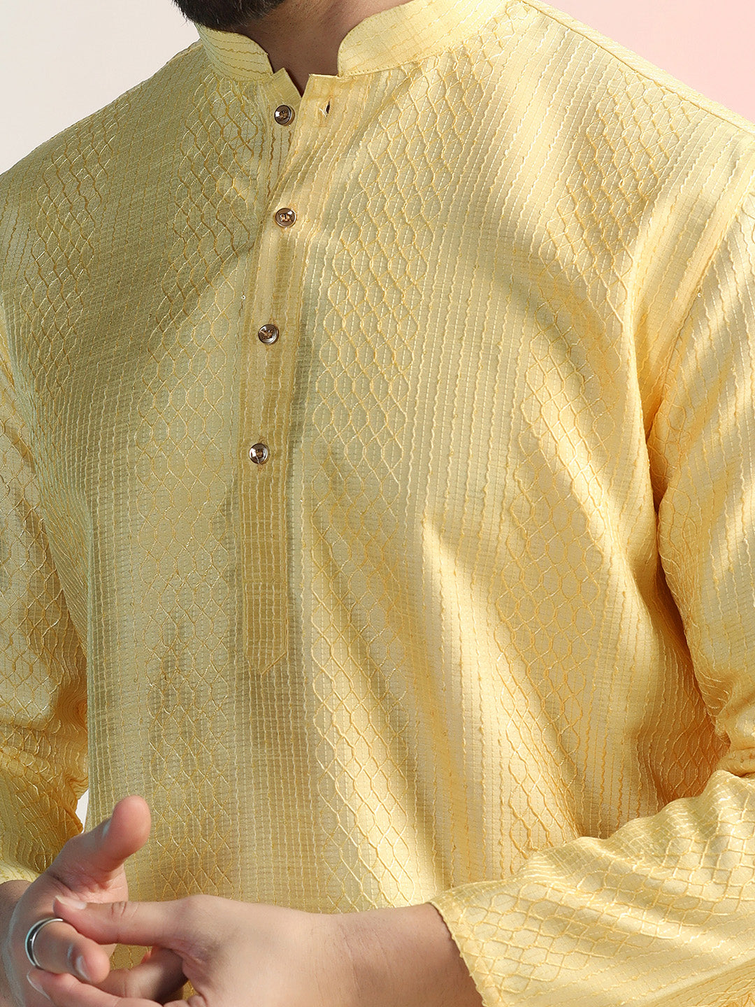 Lemon Yellow Bangalore Silk Kurta For Men with Thread Embroidery
