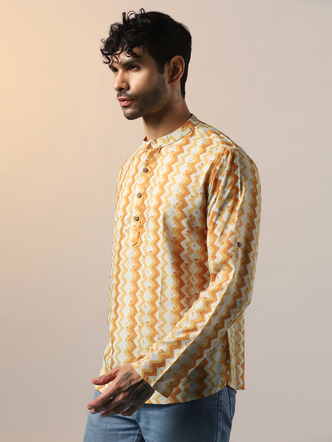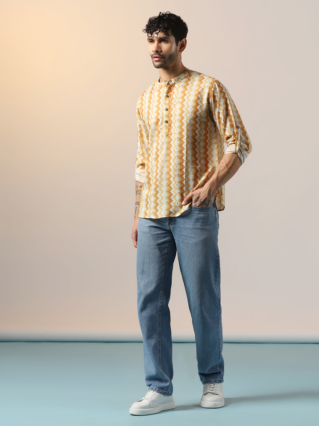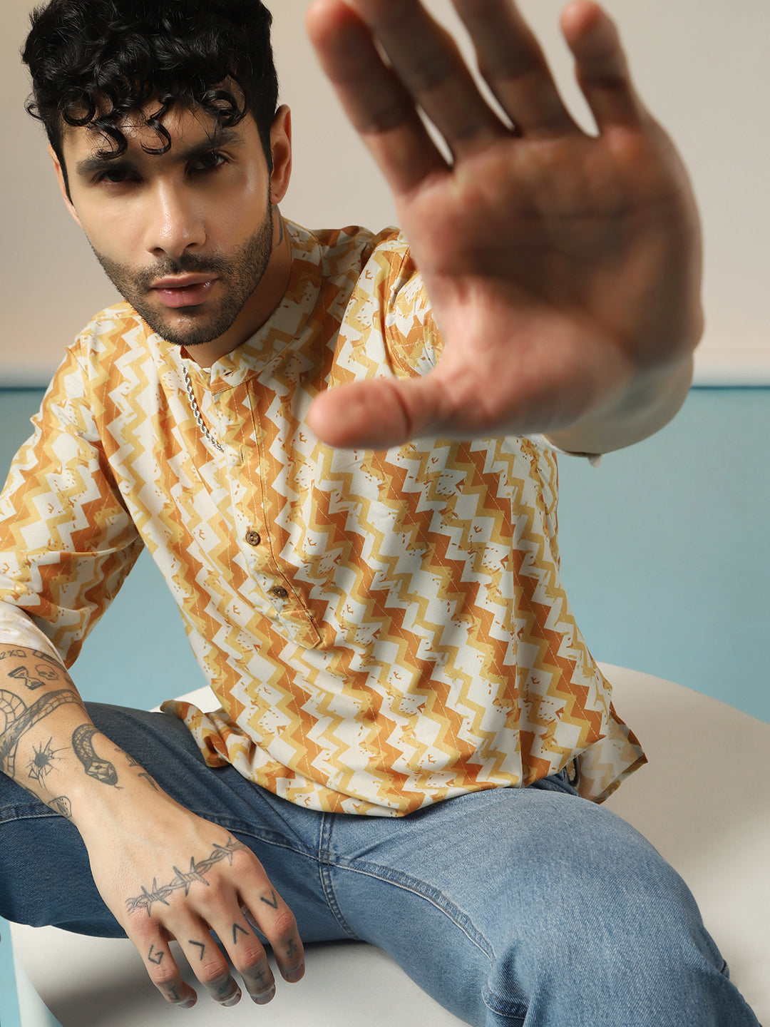 Mustard Zigzag Cotton Blend Short Kurta For Men – Bold & Bright