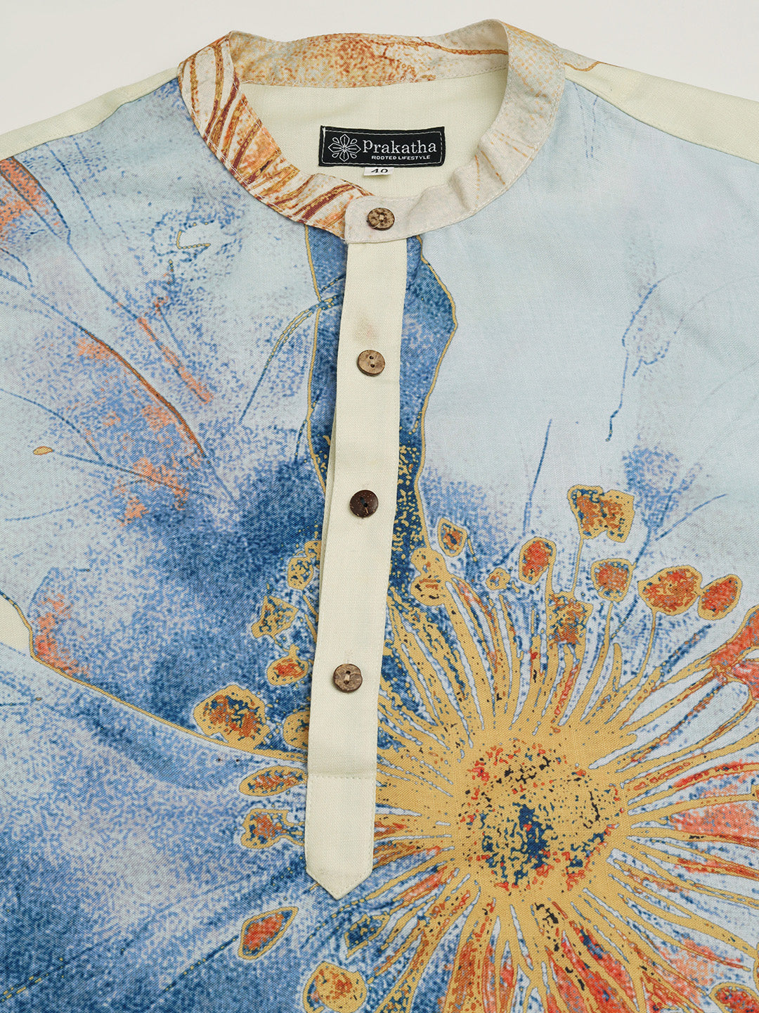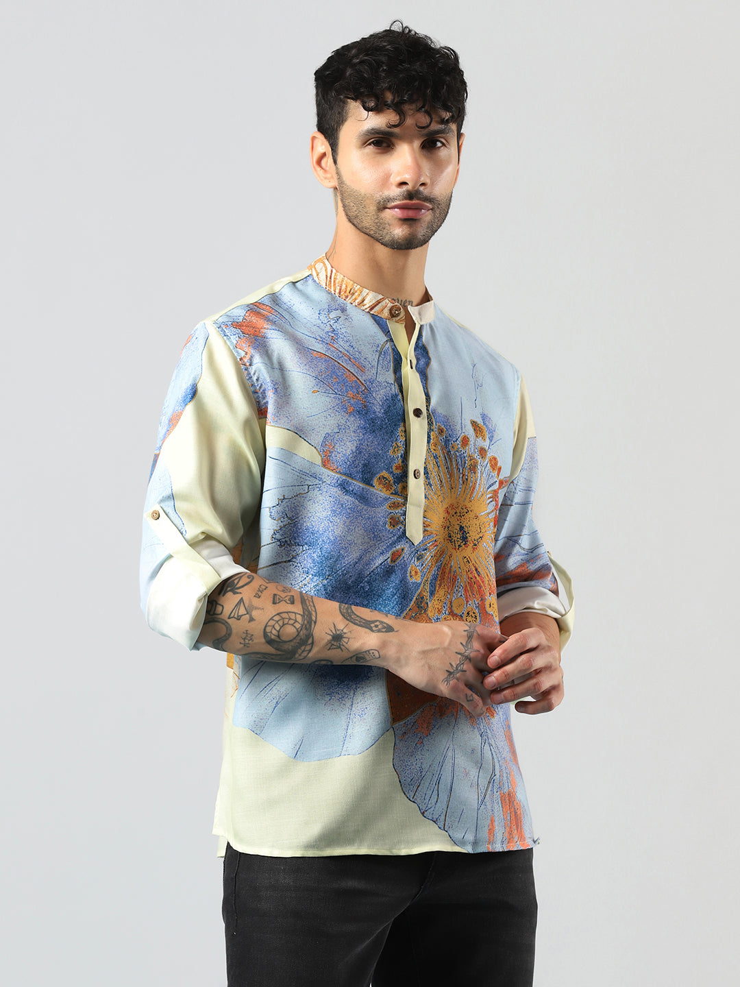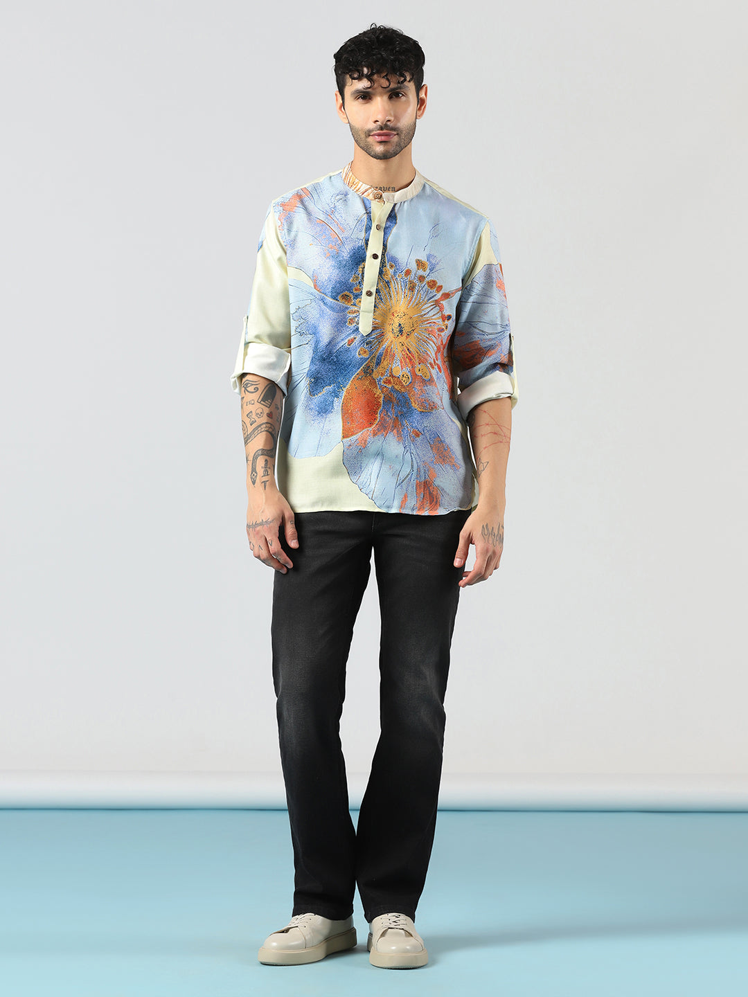 Featuring a vibrant oversized floral splash print in shades of blue, orange, and yellow on a soft cream base, this kurta combines traditional silhouette with modern art-inspired aesthetics. The band collar, buttoned placket, and roll-up sleeves with tab detail give it a clean, versatile look — ideal for everything from creative meetups to festive casuals.